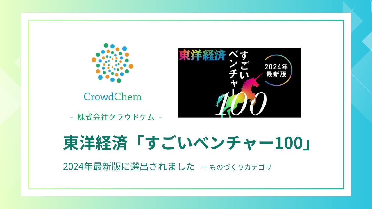 株式会社CrowdChem(クラウドケム)(本社:東京都品川区、代表:池端 久貴、以下CrowdChem)は、週刊東洋経済「すごいベンチャー100」2024年最新版に選出されたことをお知らせいたします。