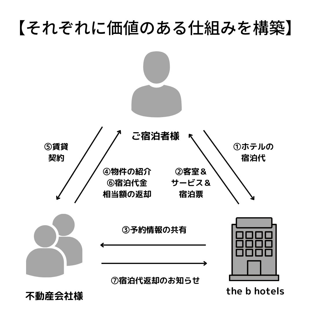 お部屋探しのためにthe b 三軒茶屋またはthe b八王子に宿泊したお客様の宿泊代金相当額(1泊分)を、賃貸契約をした該当の不動産会社様からお客様に還付する仕組みです。