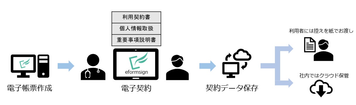 A社は電子カルテシステムを利用することで、契約後に定期的に作成する書類の一部電子化に成功していました。 しかし、電子カルテシステムで作成した文書も署名・押印のために都度プリントアウトしなければならず、完全なペーパーレス化には至りませんでした。 そこで、電子サービスと電子カルテシステムを組み合わせることで、書面のプリントアウトを必要としない完全なペーパーレス化を実現しました。
