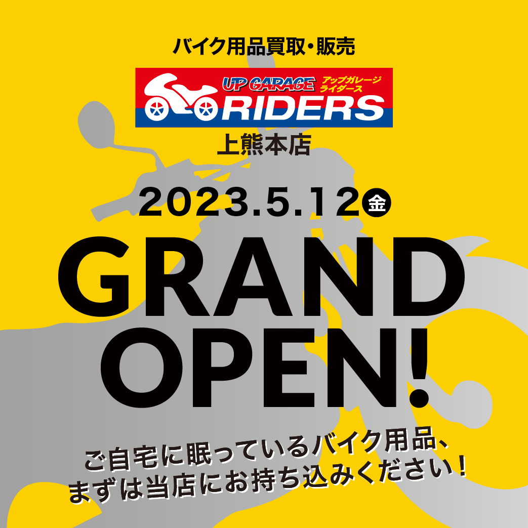 「アップガレージライダース上熊本店」のオープンを記念して、5月12日(金)~6月11日(日)に、オープニングキャンペーンを開催いたします。ぜひ、この機会にお立ち寄りください。