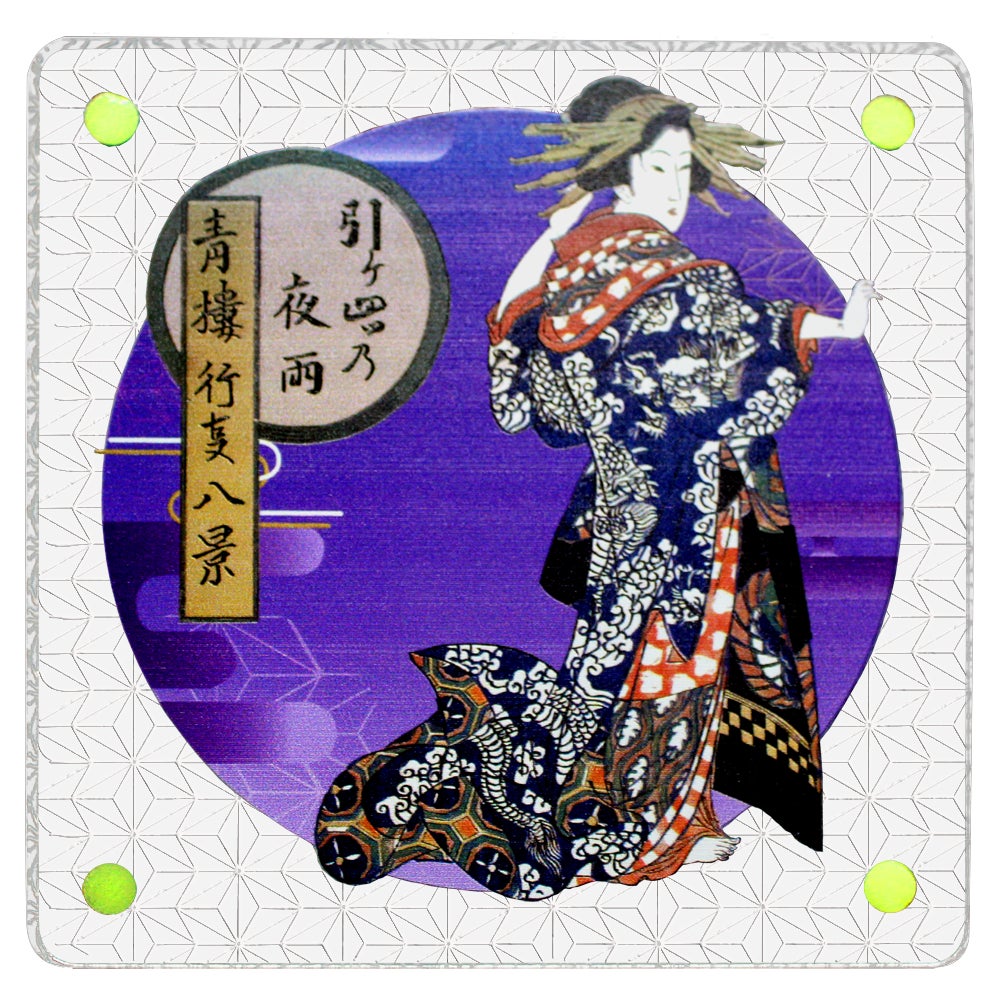 本製品は、江戸の人々の暮らしや文化を描いた名作浮世絵6作品を、自社の高精細UV印刷技術で色鮮やかに再現。透明アクリル部分には絵柄に合わせた伝統模様を精密にレーザー彫刻し、アート性を高めました。さらに、四隅には蓄光シリコン製の滑り止めを封入。昼間に光を蓄え、夜間にはやさしく発光することで、実用性と幻想的な演出性を兼ね備えた仕上がりに。約9cm角・48gの軽量コンパクトな設計で、手荷物にも収まりやすく、ギフトや旅の記念品としても最適です。