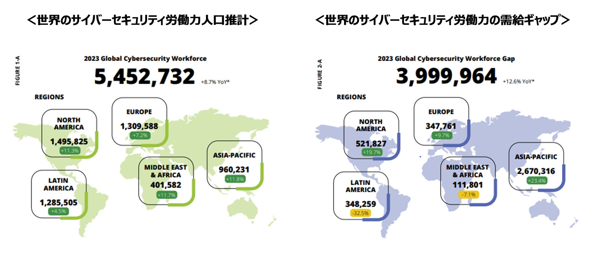 下図の通り、ISC2は現在の世界のサイバーセキュリティ人材の数を約550万人と推定しています。これは、前年比8.7%増、約44万人の新規雇用に相当します。一方で、世界的なサイバーセキュリティ労働人口が増加し続けているにもかかわらず、ISC2が実施した調査では、依然として需要が供給を上回っていることが明らかになりました。労働力の需給ギャップは、今年さらに12.6%増加し、過去最大の約400万人に迫っています。中東・アフリカやラテンアメリカのような供給が特に急増した地域ではギャップの解消が進んでいるものの、特にアジア太平洋地域(特に日本とインド)と北米で需給ギャップの格差は広がりました。