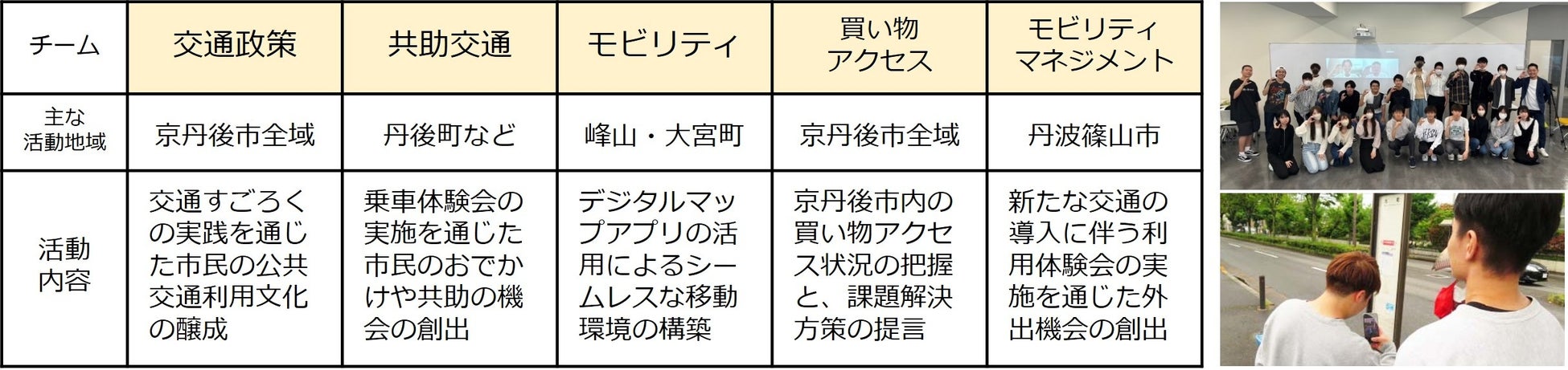 京丹後市と丹波篠山市をフィールドとして、交通政策・共助交通・モビリティ・買い物アクセス・モビリティマネジメントの5つのチームに分かれ、現場への提案・提言を目標に、コミュニティデザイン学科地域政策学コースに所属する3年生17人、2年生8人が取り組んでいます。