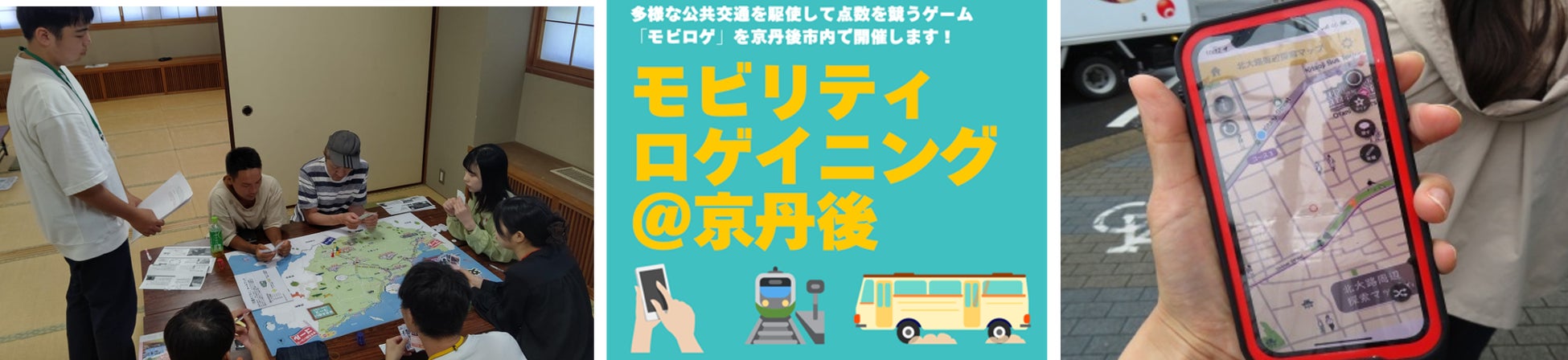 一方で、学生が行ってきたフィールドワークからは、住民から「公共交通の使い方が分からない」「免許返納後が不安」などの声が聞かれました。そこで本プロジェクトでは「公共交通の利用文化の醸成」を目標に、さまざまな仕掛けづくりに取り組んでいます。本プロジェクトの第1弾として、8月18日(日)には学生考案の「交通すごろく」ワークショップを開催し、学生が調査した京丹後市の地域交通の現状報告に続いて、市議会議員などと共に「交通すごろく」を実施いたしました。市内の地域交通の現状や課題、未来についての活発な意見交換の場となるとともに、実際に行動に移してもらうために「次にどのような仕掛けが必要か」という気づきを得ました。そこで今回、本プロジェクトの第2弾として、物理的な移動を伴う野外活動ゲームとして「モビリティロゲイニング(通称モビロゲ)」を京丹後市内で実施します。