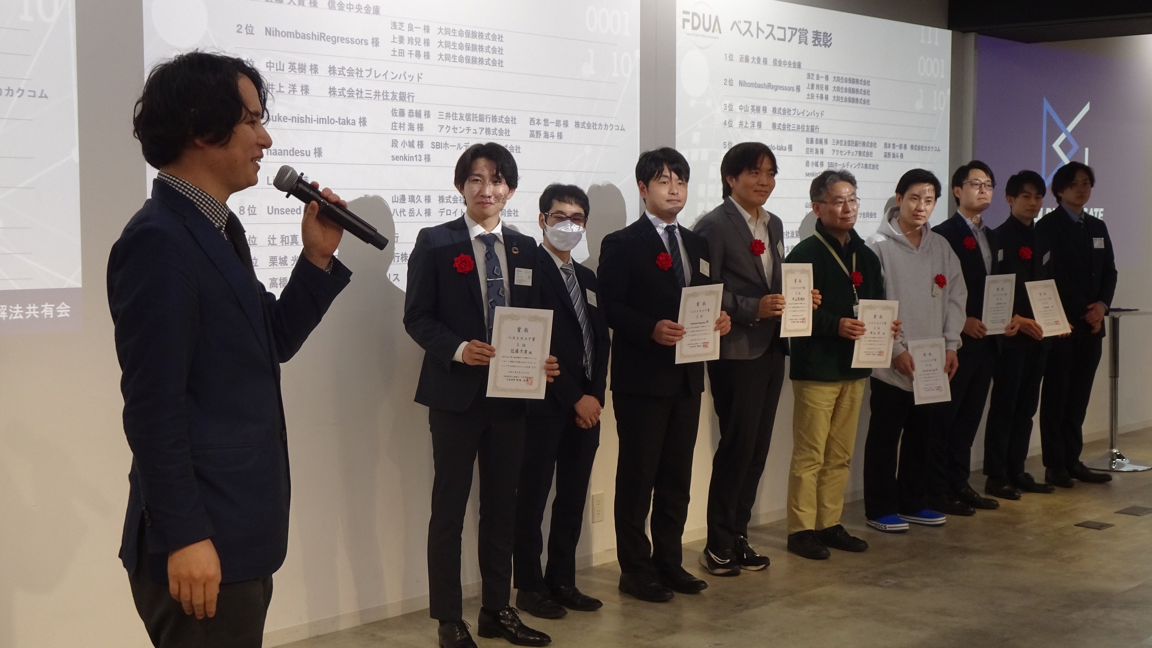 表彰式では岡田 拓郎 氏(金融データ活用推進協会 代表理事)がプレゼンターを務め、優秀な成績を収めた上位表彰者の発表を行いました。また、表彰式や解法共有会の後には現地で参加いただいた方々によるネットワーキングが開催され、普段関わることのできない金融機関や世代の垣根を超えた、データサイエンスの分野での取り組みや悩みを共有いたしました。