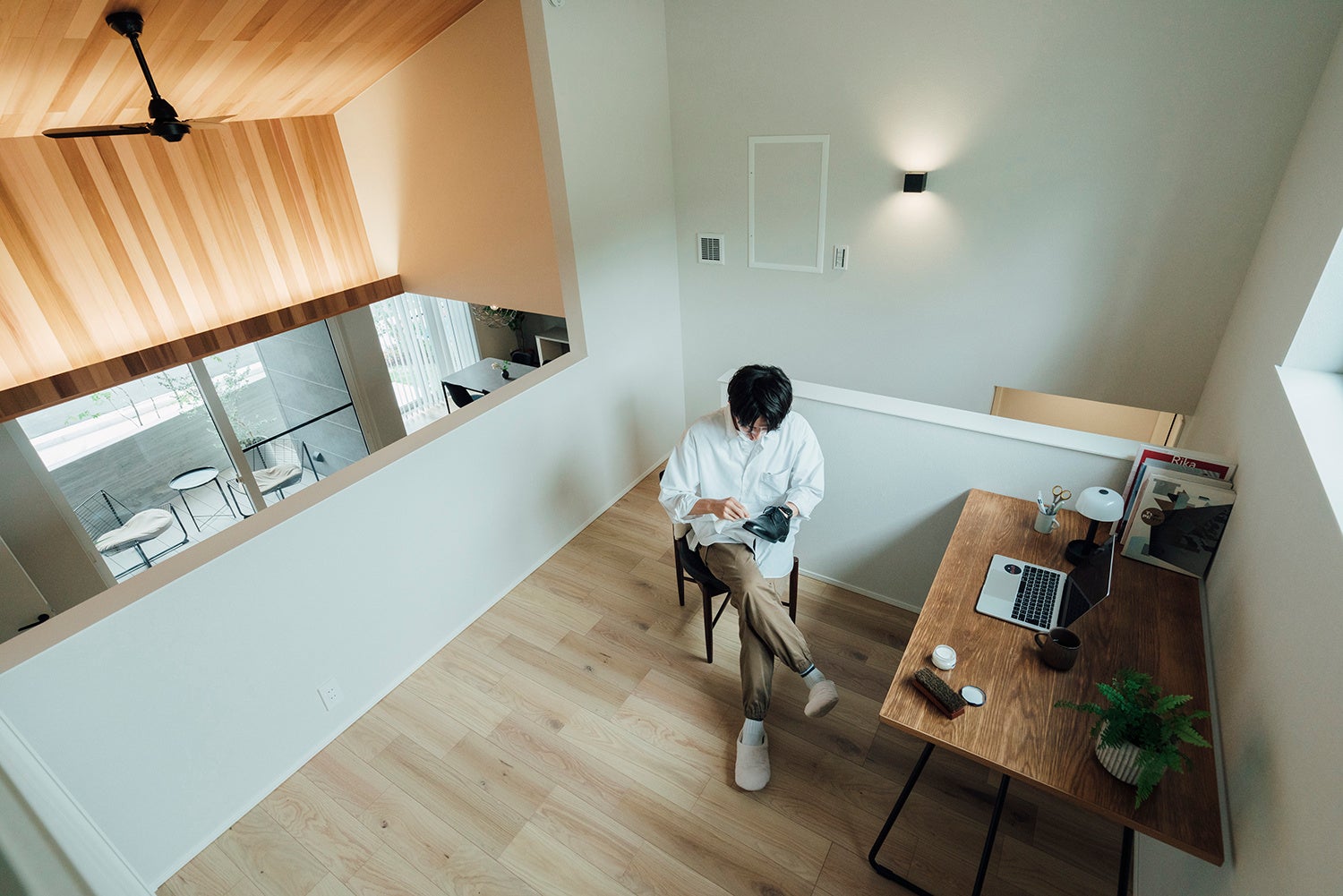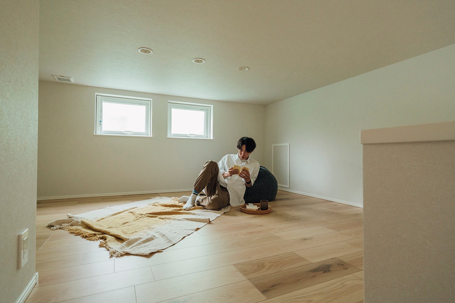 1階から約1.6mスキップしたフリースペースは、趣味や遊び、ワークスペースとしても利用可能。さらに将来的に、つながるロフトと一体利用して3部屋目としての利用も可能です。