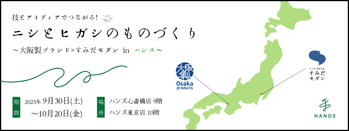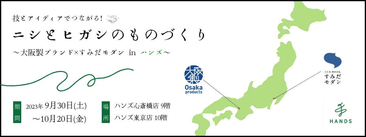 大阪府知事が認定する「大阪製ブランド認定事業(※1)」では、東京都墨田区の「すみだモダン」とのコラボレーション企画として、「技とアイディアで繋がる!ニシとヒガシのものづくり ~大阪製ブランド×すみだモダン in ハンズ~」と題した展示・販売イベントを、ハンズ心斎橋店・東京店にて9月30日(土)から10月20日(金)まで実施します。