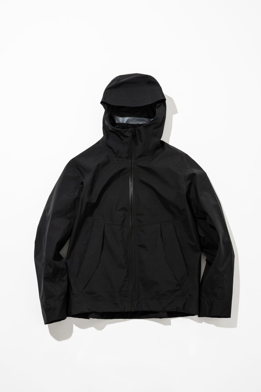 通常はセパレートしているネックからフードにかけて、一体になっているのが1番の特徴で、生地がもつ防風・防水というスペックだけに依存しない、プロダクトとしての構造をパターンによって落とし込んでいます。首元のコードを引くことで、フードの高さが調節可能。フード後方のコードによって、フードのフィットの調節も可能なため、頭の形や天候に合わせて自在にアレンジできます。