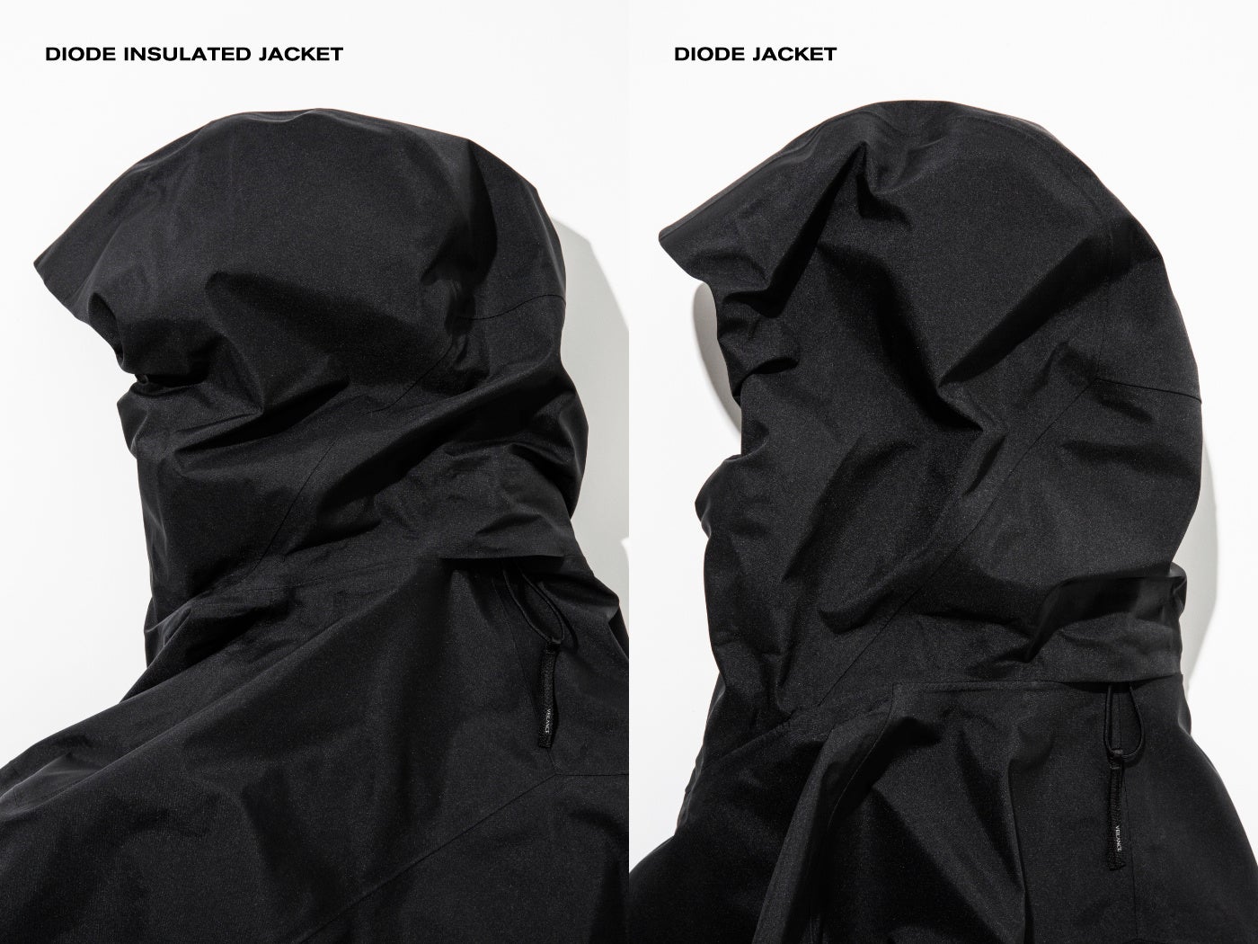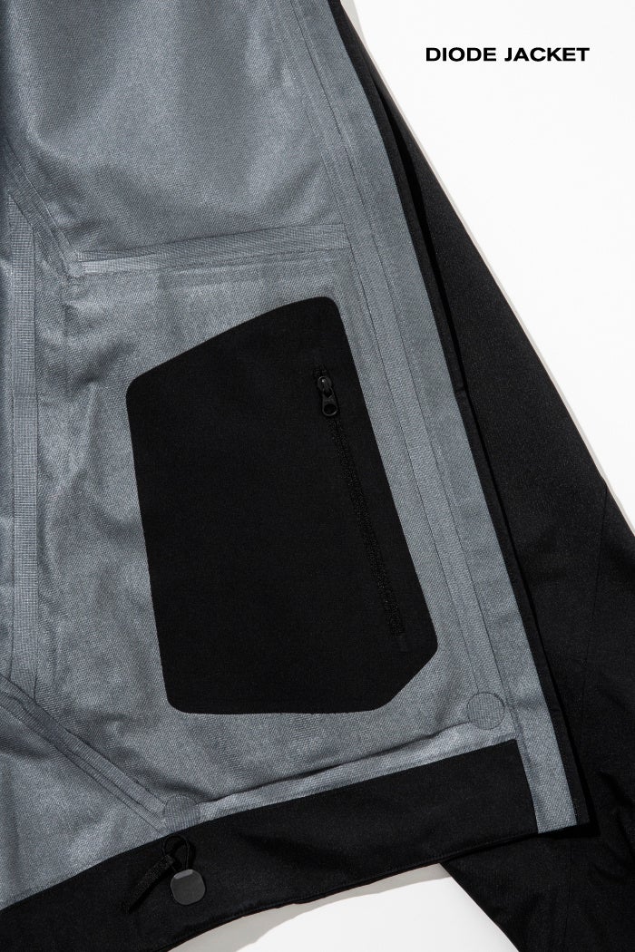 今回発売となる「Diode Jacket(ダイオード ジャケット)」と「Diode Insulated Jacket(ダイオード インサレーテッド ジャケット)」は、リサイクルナイロンとPFASフリーの「GORE-TEX ePE メンブレン」を採用し、二酸化炭素の排出量を抑えるなど、環境へのダメージに配慮したハードシェルジャケット。軽量で高い保温性の確保とハードシェルとしての機能をVEILANCEらしく、タイムレスで洗練されたデザインに仕上げました。