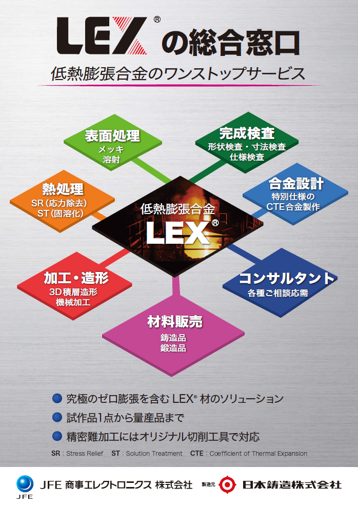 低熱膨張材「LEX(R)」および究極の“熱膨張ゼロ”を叶える合金材料「LEX-ZERO(R)」は、日本鋳造株式会社が提供する低熱膨張合金です。J商エレでは、「LEX(R)」の販売はもちろん、合金設計から加工・造形・熱処理・表面処理・完成検査までもワンストップで提供する「LEX(R)の総合窓口」を展開しています。
