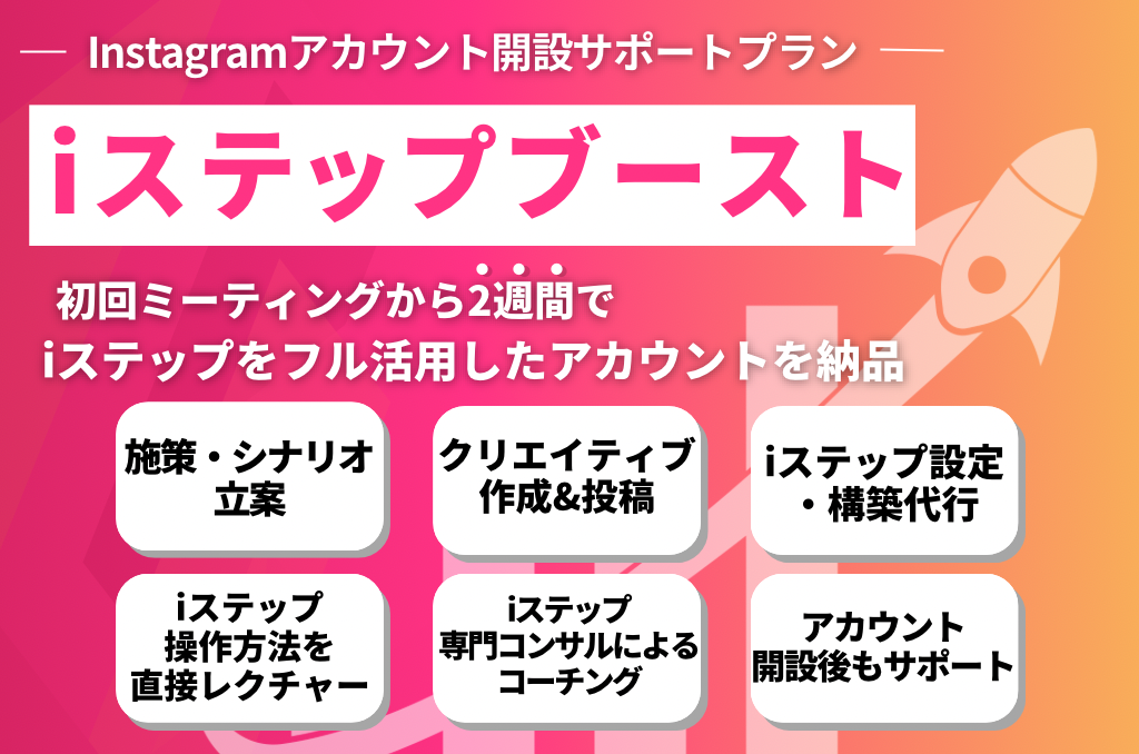 そこで、Instagramを運用し自社商品・サービス情報を消費者に届けたい全国の中小企業向けに新サービス「iステップ ブースト」を販売いたします。こちらのプランは、弊社が持つInstagram運用ノウハウを提供してInstagramアカウントを開設し、弊社が開発したInstagramチャットボットツール「iステップ」を利用してアカウント立ち上げ時に一気に認知拡大を狙うInstagramアカウント開設サポートサービスです。
