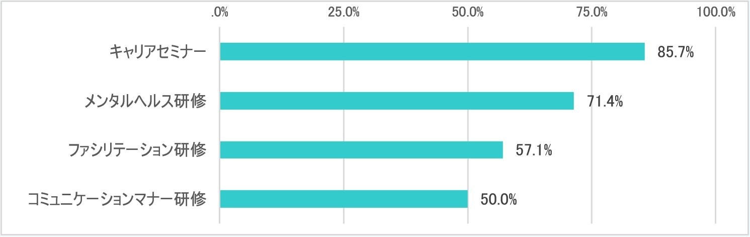 「キャリアセミナー」(85.7%)が最も多く、次いで「メンタルヘルス研修」も71.4%と多くの希望が集まる結果となった。