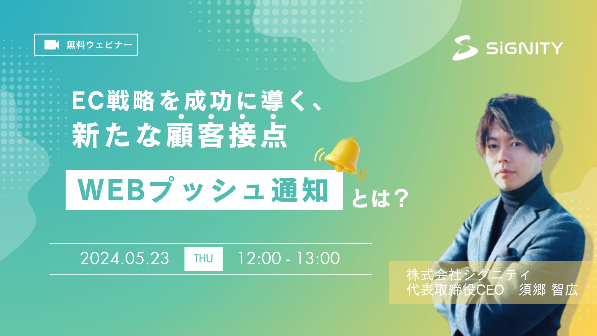 WEBプッシュ通知「PUSH ONE」を通じてWEBサイトとユーザーの最適な接点を築く株式会社シグニティ(所在地:東京都江東区、代表取締役CEO:須郷 智広、以下:シグニティ)は、2024年5月23日(木)に無料オンラインウェビナー『【リピーター施策】EC戦略を成功に導く、新たな顧客接点「WEBプッシュ通知」とは?』を開催いたします。