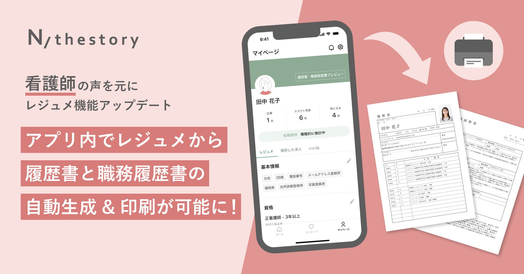 看護師のジョブマッチングアプリ「N/thestory(ジストリー)」看護師の意見を反映してアプリのレジュメ機能をアップデート レジュメ登録した内容から履歴書・職務経歴書を自動生成し、そのまま印刷可能に