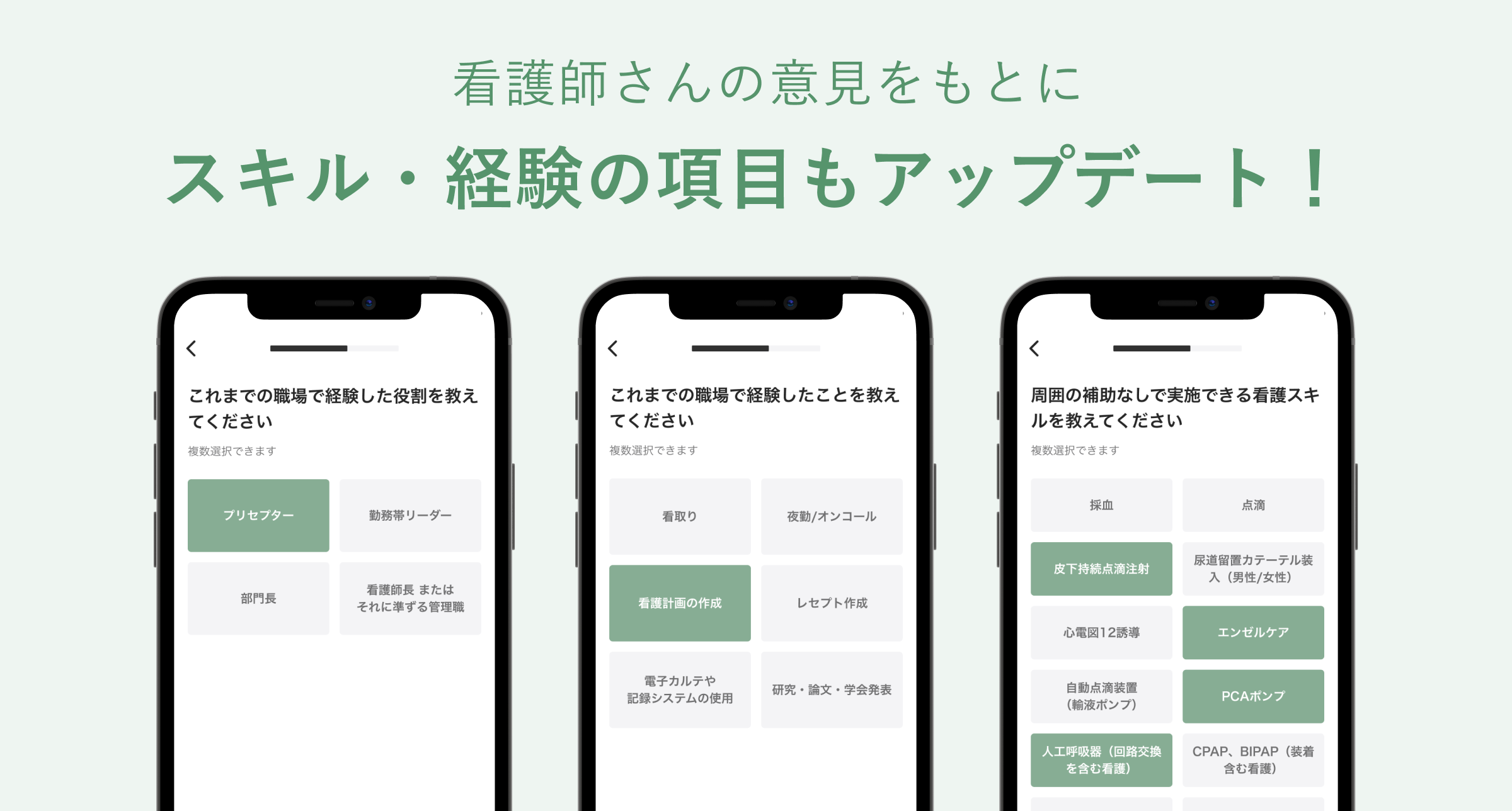 これまで「経験のある役割や研究等」となっていた項目を「経験した役割」「経験したこと」に分け、内容を一部変更しました。また、「実施できる看護スキル」の聞き方・項目を変更しました。