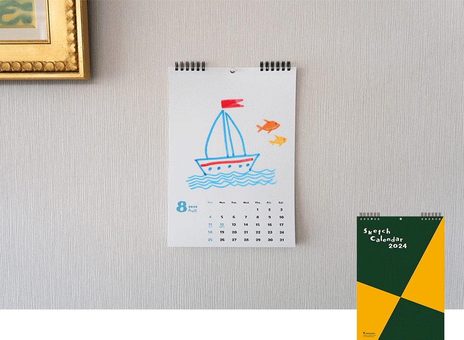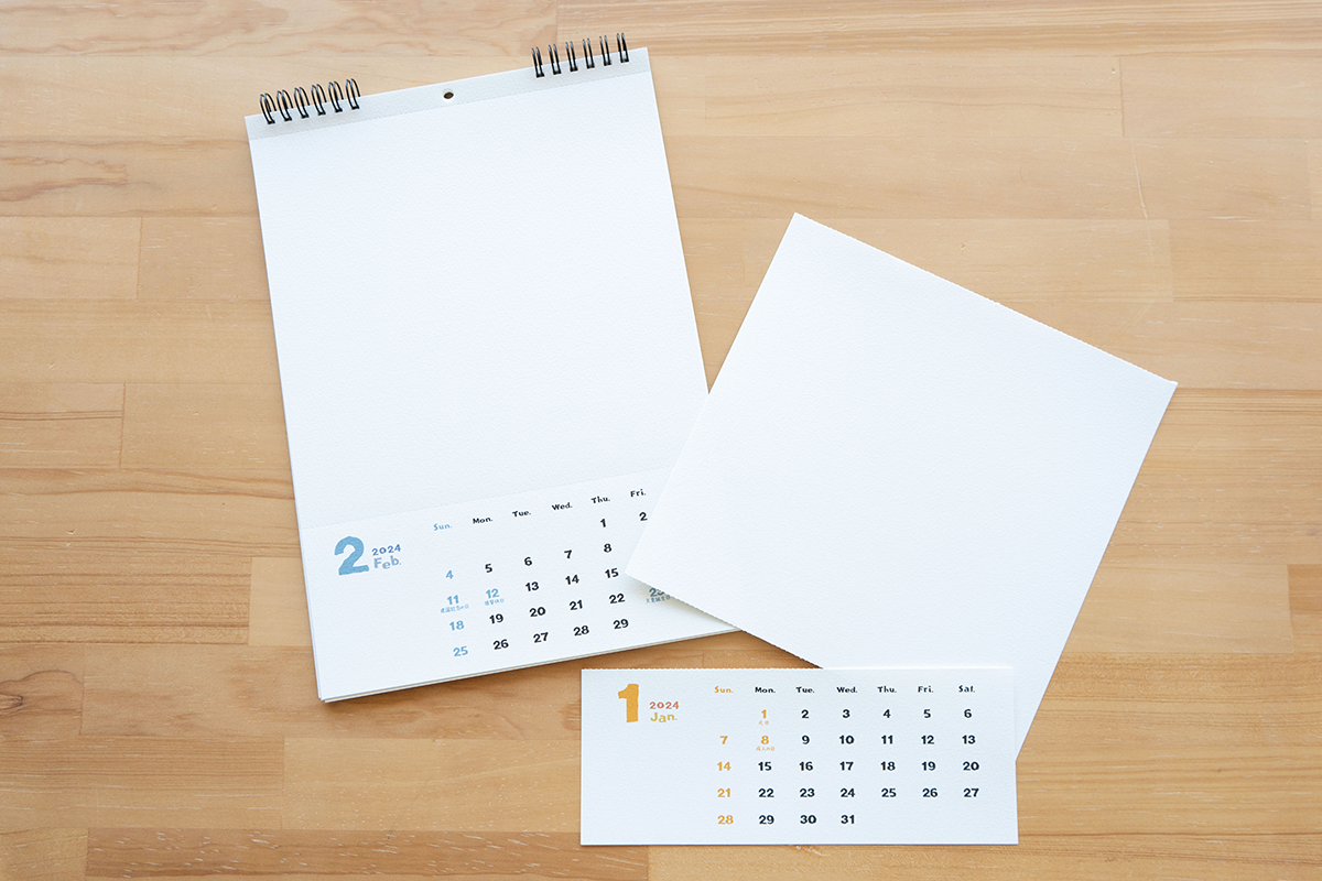 図案スケッチブックと同じ画用紙を使用した、A4サイズの壁掛けカレンダーです。毎月の挿絵を描いてオリジナルのカレンダーが作れます。ミシン目入りなので、カレンダーとして使用後は不要な部分を切り離し、描いた絵だけを保存しておくことができます。