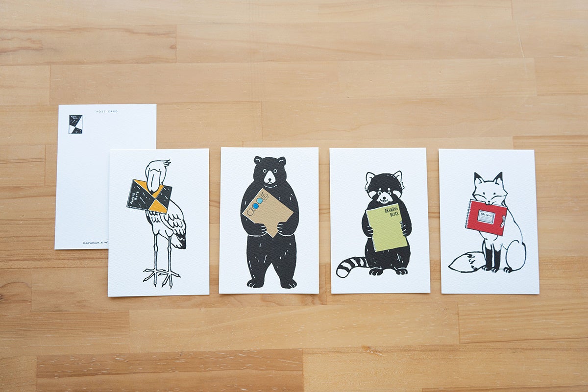 マルマンの代表的なスケッチブックを持った浅野みどりさんの動物イラスト全10柄のポストカードです。