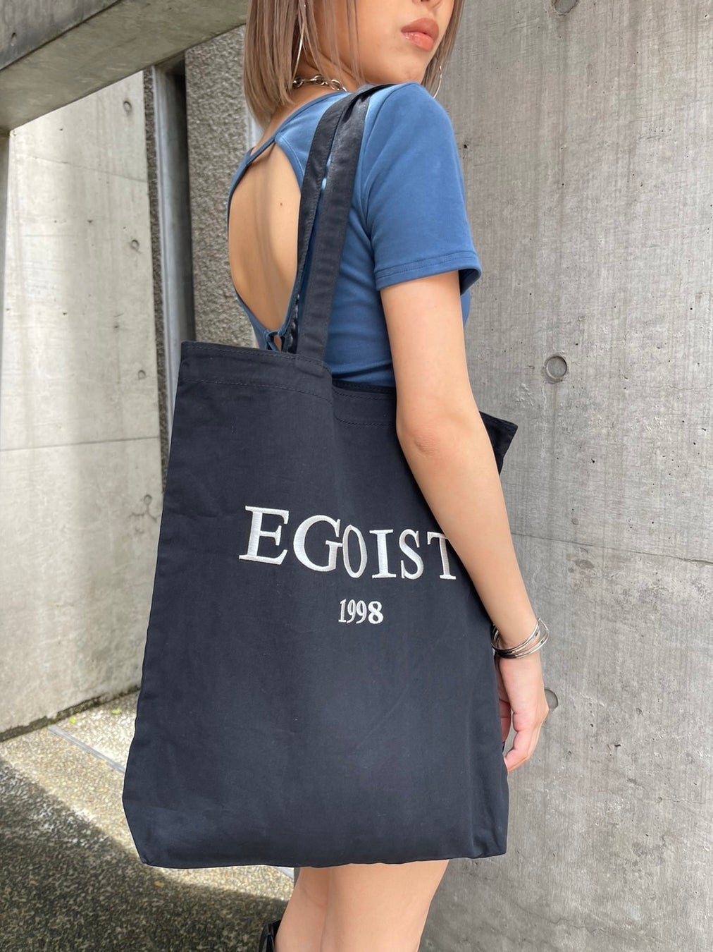 フロントには【EGOIST】ロゴと【1998】のナンバーを華奢なフォントの刺繍で施しています。サブバッグとして使いやすい大きさでA4サイズも楽々と入れて頂けます。肩掛け出来る持ち手の長さであると便利な内ポケット付きです。