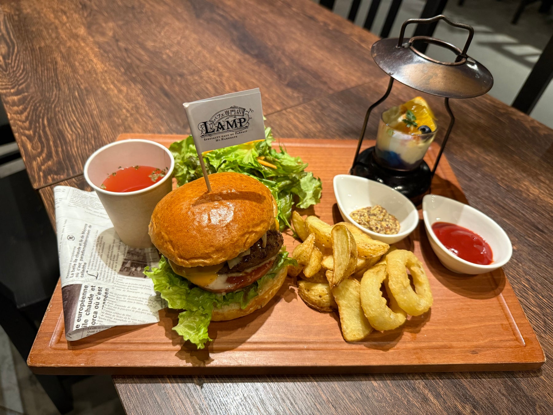 パフェ専門店「LAMP」では、近江牛をパティに使用したオリジナルハンバーガーとポテト、サラダ、スープ、ミニパフェがセットになった「近江牛ハンバーガーセット」などのランチセットを販売しています。アクティビティに向けた腹ごしらえや、アクティビティ後の空腹時に特産品を使用したボリューム満点のランチをお召し上がりください。