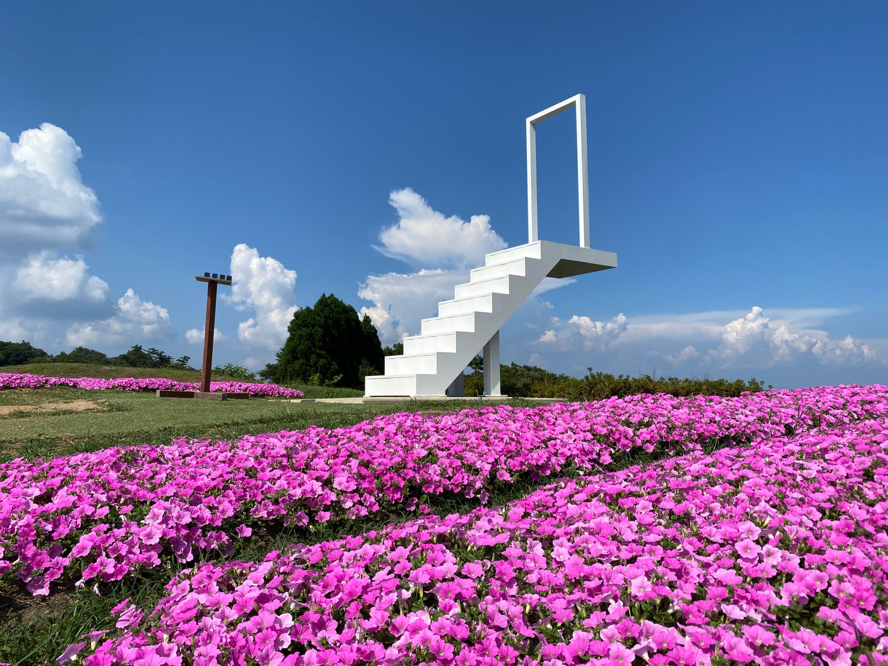 びわこ箱館山には、ひまわりやピンクのペチュニア“桃色吐息”など、季節の花が咲き誇る花畑が広がっています。季節によって表情を変える花々をお楽しみください。また、花畑にはベゴニアやインパチェンスの花を使用した、高さ約2mの立体フラワーアートや、天空へと続く階段「ステアーズフラワー」を設置しています。写真映え間違いなしの大人気フォトスポットです。