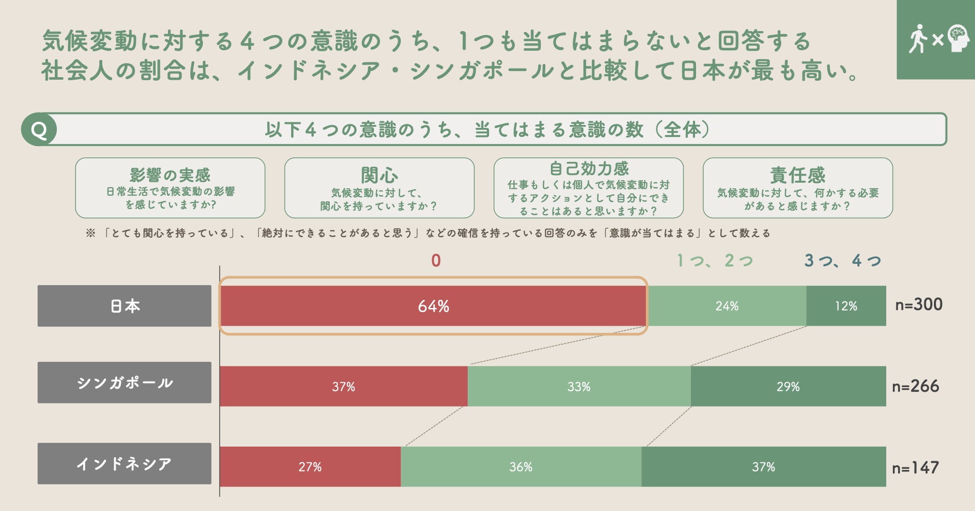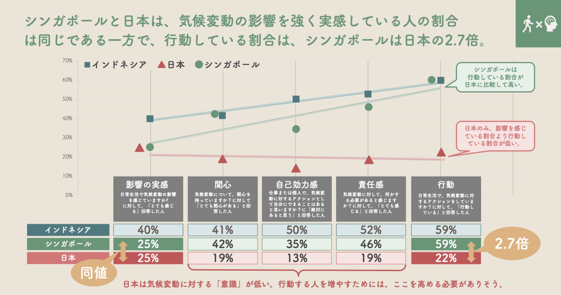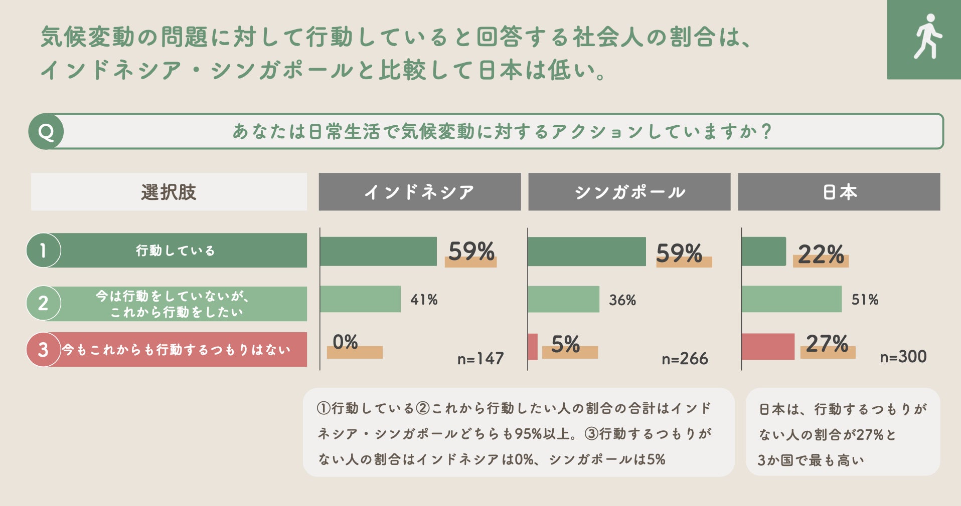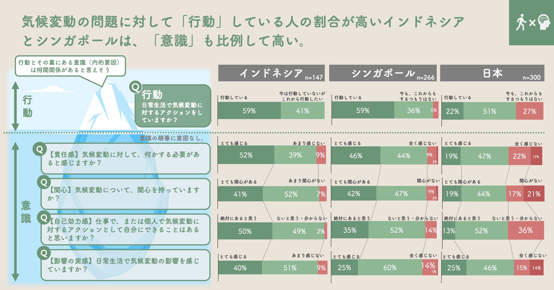 Earth Companyは、企業へ気候変動に関連する研修を行ってきた経験から、長期的な気候変動対策を実行していくためには、組織に所属する個人が「世界と自分とのつながりを実感すること」が大切だと考えます。そこで、日本・インドネシア・シンガポールの3カ国で、気候変動に対する意識と行動に関するインターネット調査を実施。本レポートでは気候変動に対して「行動している人」と「行動していない人」とでは何が違うのかを調査しました。気候変動に対する①影響の実感、②関心、 ③自己効力感、 ④責任感の4つの意識に注目し、行動と意識の相関関係を明らかにしています。