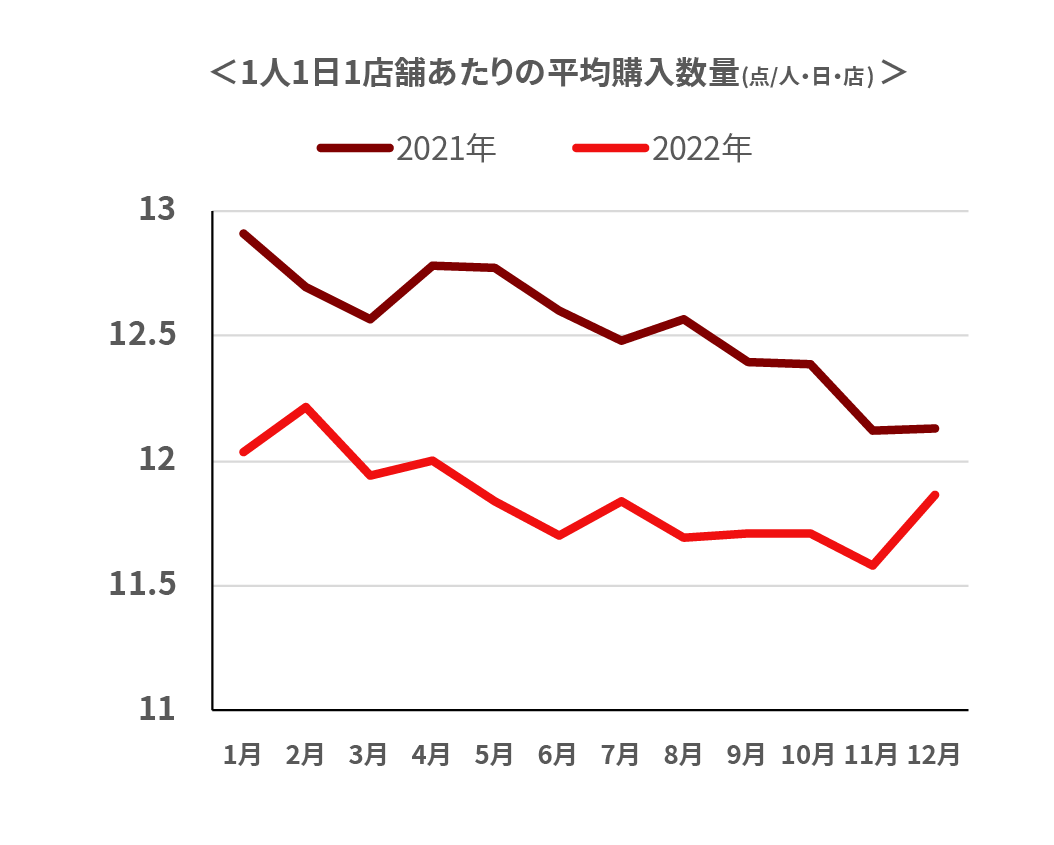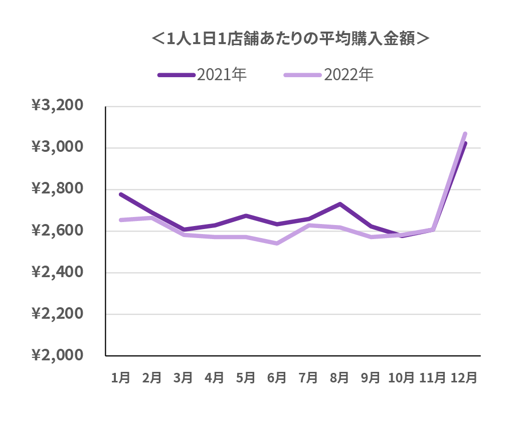 2022年は平均購入金額 約2%減 に!平均単価約4%増、平均購入数量約6%減と単価上昇かつ数量減少傾向に。長引く値上げ影響か