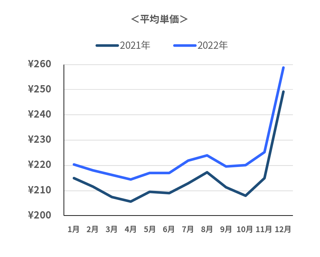 なお、2022年12月の平均単価の数値は約259円と、2019年の増税以降過去最高の高値を記録しました。