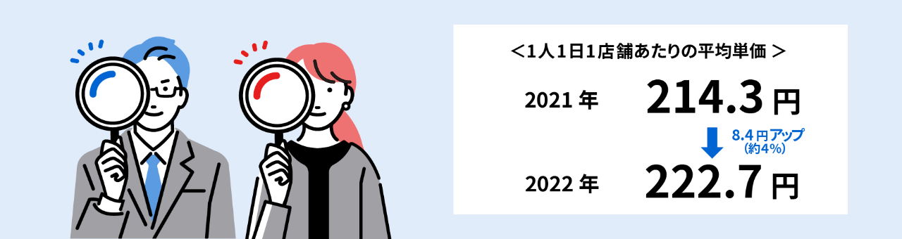 今回は、全国のスーパーでの買い物(1人1日1店舗あたり)平均購入金額・単価・数量データを、2021年と2022年の年間で比較調査いたしました。その結果、平均購入金額は2021年比※1約2%(47円)減となり、その要因として平均単価は2021年比約4%(8円)増、一方平均購入数量は約6%(1点)と減少しております。