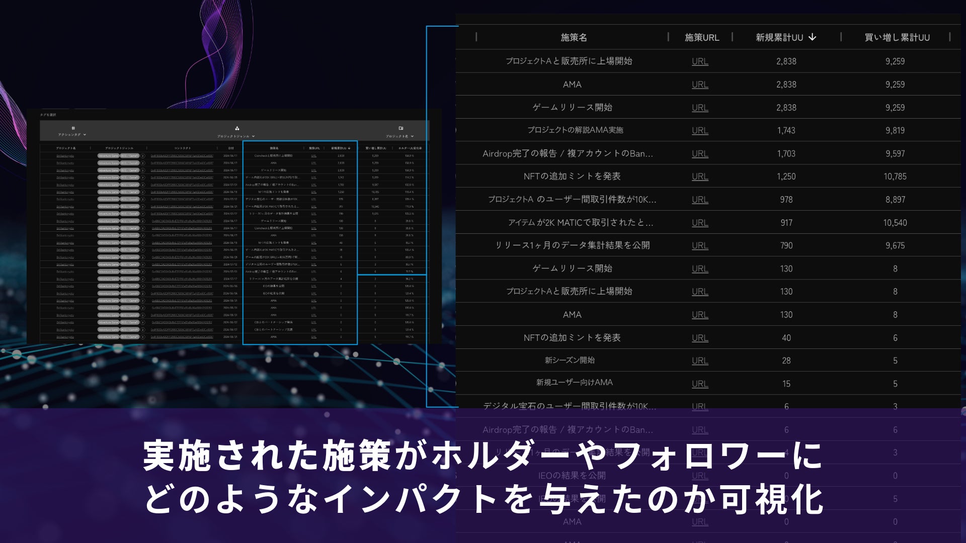 ベンチマークプロジェクトにおけるマーケティング施策のタイムラインとオンチェーンデータを統合することにより実績ベースの施策リサーチが可能に