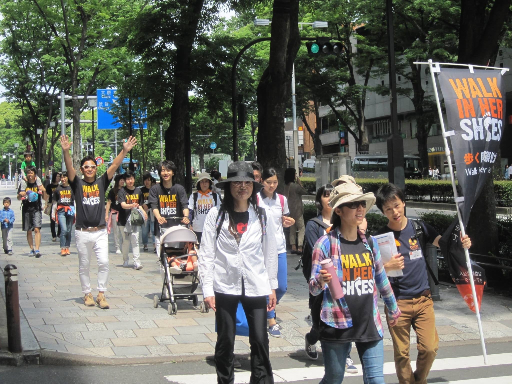 東京都内で開催されたチャリティウォークでキャンペーンTシャツを着用して歩く参加者たち