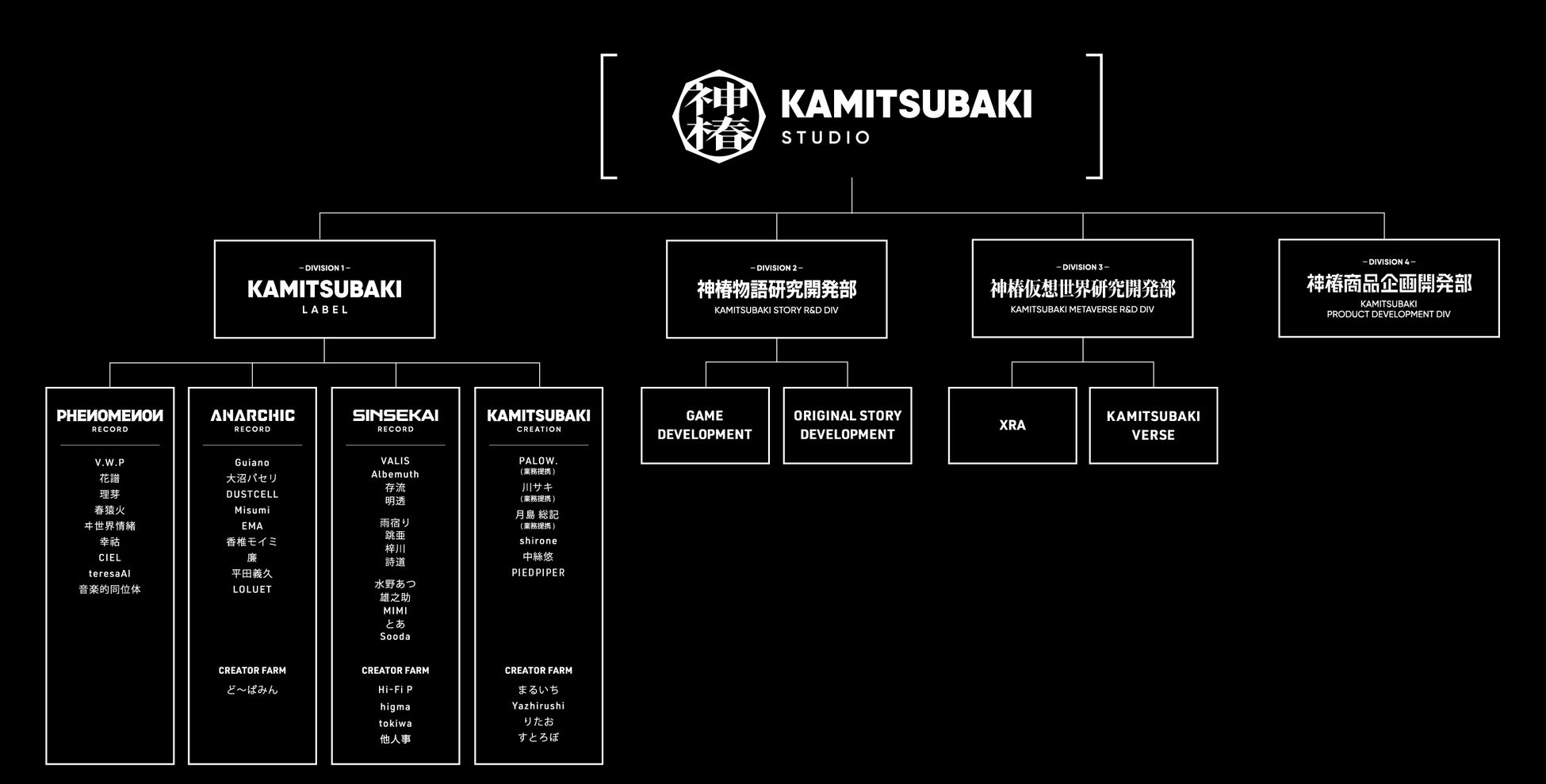 また、「KAMITSUBAKI LABEL」以下には、かつて姉妹スタジオであった「SINSEKAI STUDIO」所属アーティストらを含め、さらに4つのレーベルを新設。