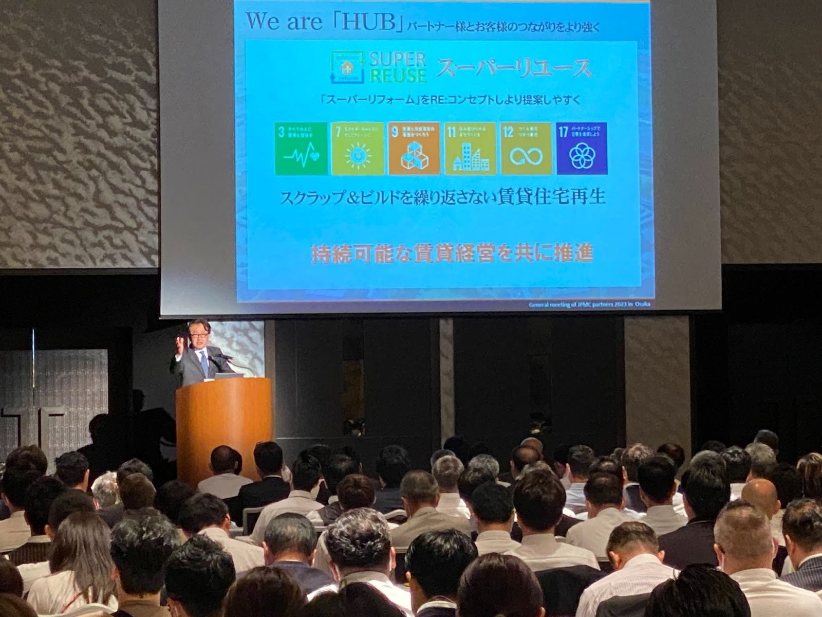 JPMCパートナーズ大会は、JPMCのパートナー制度に加盟いただいている不動産関連事業者(不動産管理会社・建築会社・介護事業者等)約1,400社や、業務提携をしている協力企業が一堂に会する全国大会です。年に1度のペースで開催しており、本年はヒルトン大阪で開催いたしました。