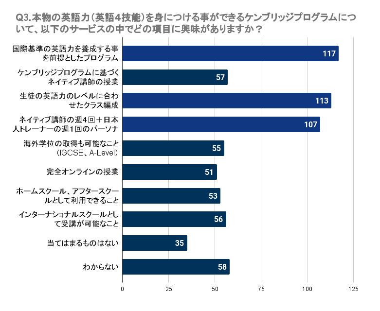 Q3で「本物の英語力(英語4技能)を身につける事ができるケンブリッジプログラムについて、以下のサービスの中でどの項目に興味がありますか?(複数回答可)」と質問したところ、兵庫県で最も多かったのは「国際基準の英語力を養成する事を前提としたプログラム」で117名でした。次いで、「生徒の英語力のレベルに合わせたクラス編成」には113名、「ネイティブ講師の週4回+日本人トレーナーの週1回のパーソナルトレーニング」には107名が興味を持っています。一方で、「完全オンラインの授業」や「ホームスクール、アフタースクールとして利用できること」に関心を持つ人はやや少なめで、それぞれ51名、53名の回答でした。これらの結果から、多くの人は実用的な英語力の養成や個別のニーズに応じた指導に重きを置いていることが伺えます。