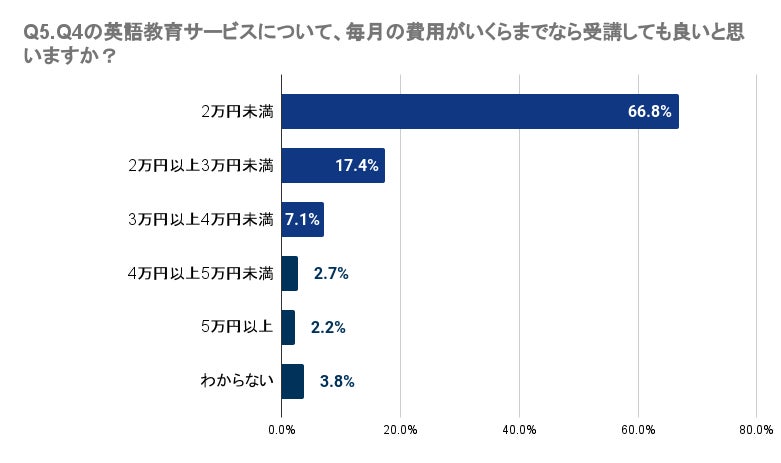 Q3・Q4では、「本物の英語力(英語4技能)を身につける事ができるケンブリッジプログラム」について、約80%の人が興味があるまたは受講したいと回答し、サービス内容では国際基準の英語力の養成や個別のニーズに応じた指導に興味があることが分かりました。さらに、Q5では84.2%の人が3万円未満の金額で受講したいと考えていることが分かりました。