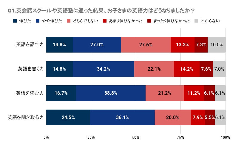 Q1で「英会話スクール、英語塾に通った結果、お子さまの英語力はどうなりましたか?」と質問したところ、兵庫県では英会話スクールや塾に通って英語のスキル向上を明確に感じられなかったと感じている人が一定数いることが分かりました。具体的には、英語を話す、書く、読む、聞き取る各スキルにおいて、「伸びた」と感じる人は約15%~25%であり、一方で「あまり伸びなかった」や「まったく伸びなかった」と回答した人が合わせて約13%〜22%となっています。特に、「英語を話す力」と「英語を書く力」においては「あまり伸びなかった」と「まったく伸びなかった」の合計がそれぞれ20.6%、21.8%となっています。また、各スキルに関して「どちらでもない」と答えた人も含めると、約33%~48%となっており、明確な効果を実感していない人が一定数存在することが伺えます。