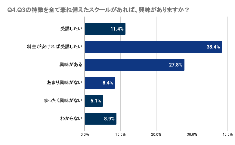 Q4で「Q3の特徴を全て兼ね備えたスクールがあれば、興味がありますか?」と質問したところ、兵庫県では11.4%が受講を希望し、38.4%は料金が手頃であれば受講したいと考えています。さらに、27.8%は興味を示していると回答しました。多くの人がこのような特徴を持つスクールに一定の興味を示していることが分かります。