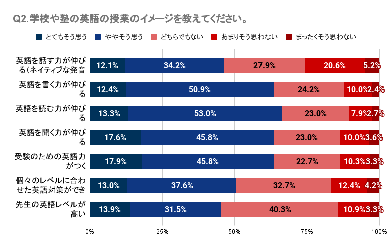 Q1・Q2では、子どもが英会話スクールや英語塾に通っていたが英語力アップの効果を感じていない人が一定数いること、学校や塾の英語の授業に対して明確な効果や良い印象を持てていない人が多いことが明らかになりました。