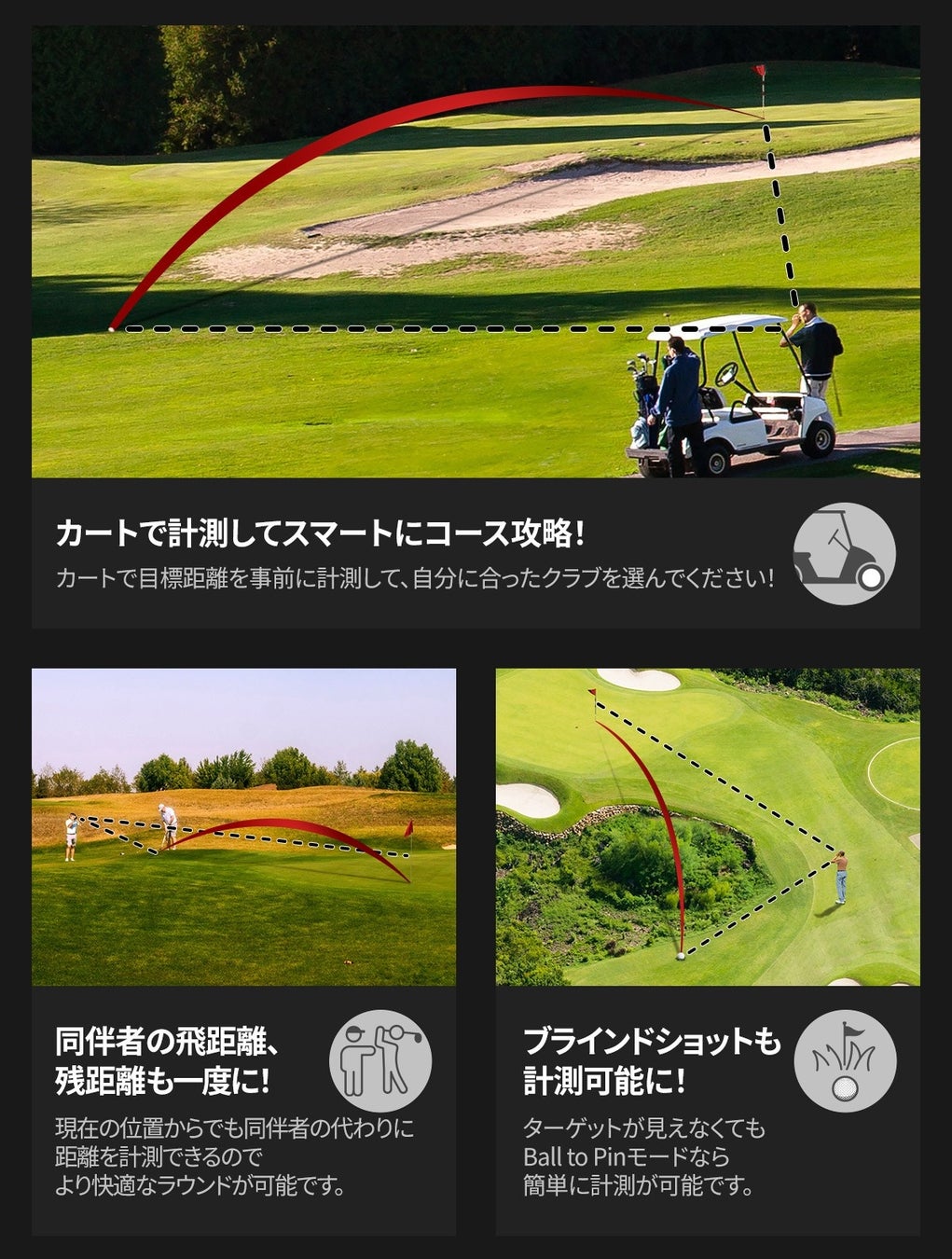 どこにいてもボールからピンまでの距離を計測できるので、同伴者にとっても頼れる存在となれます。