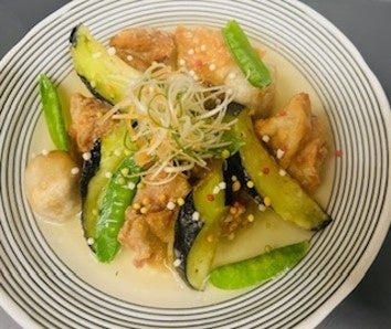 ②宮崎県産鶏肉と茄子、里芋の揚げ出し 1,100円(税込)