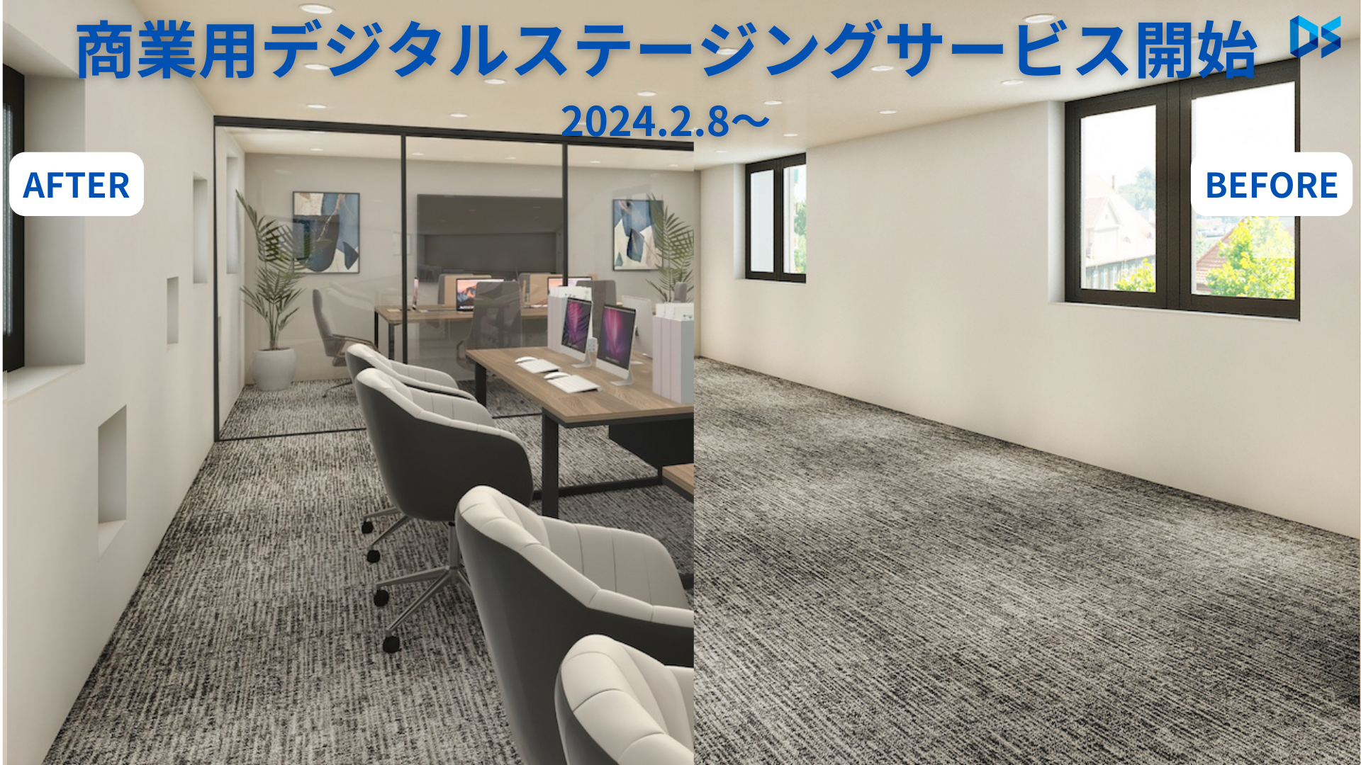 これまで居住用デジタルステージングがメインだったが、オフィス、カフェなどの商業用物件にも対応する新たなサービスをリリース。