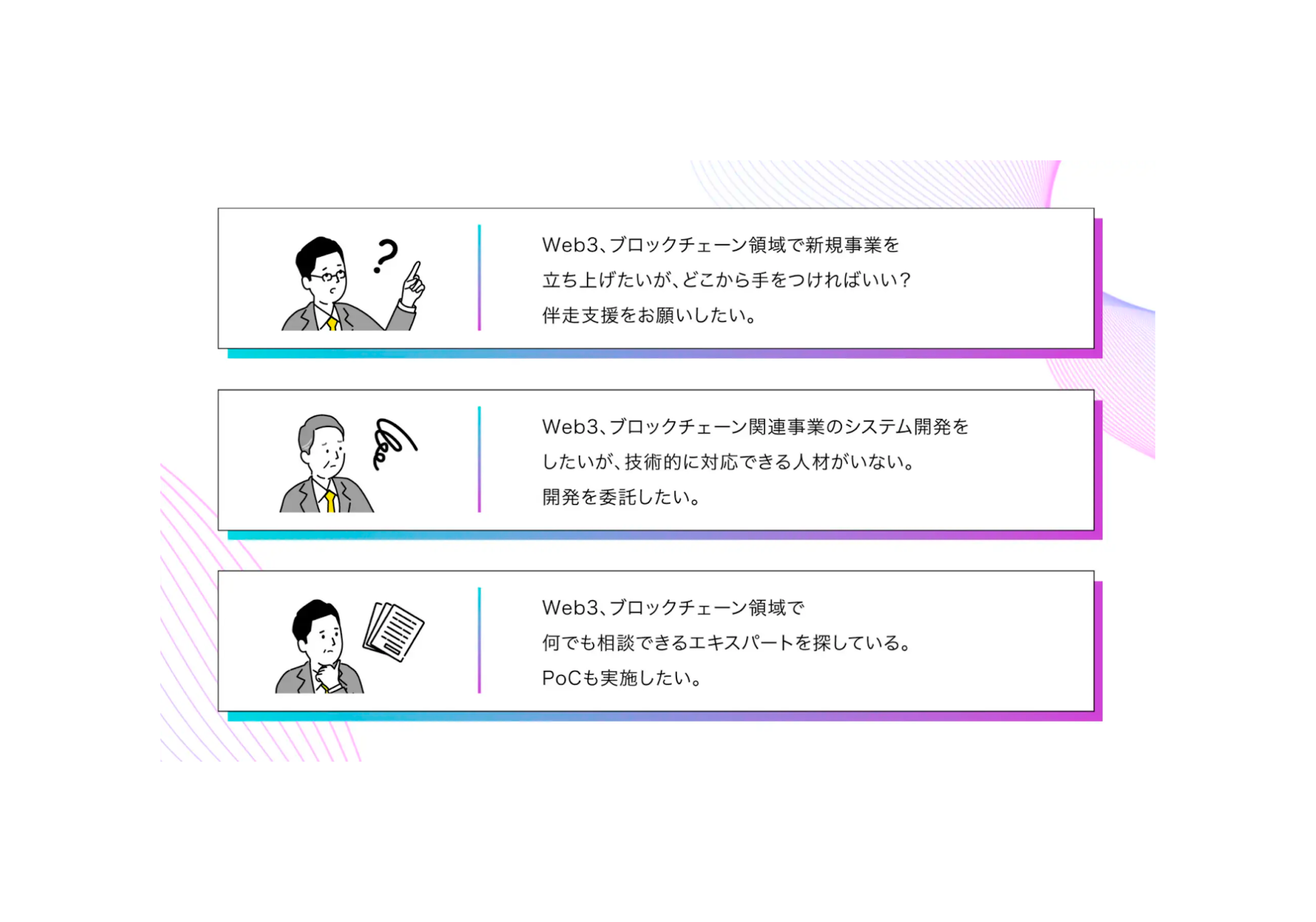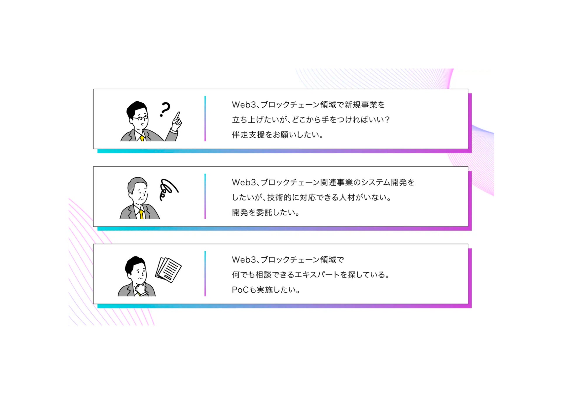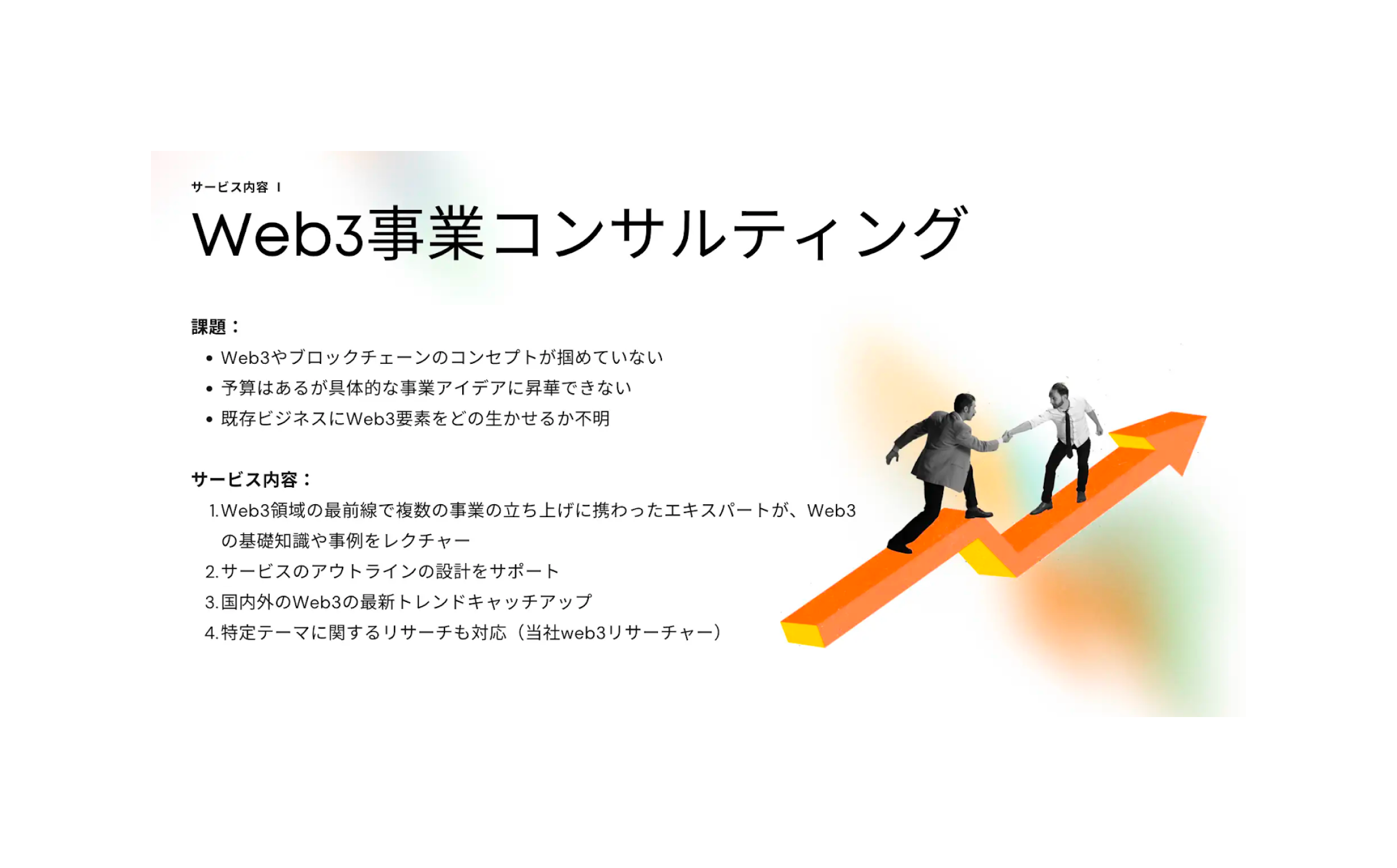 ・Web3、ブロックチェーン領域のキャッチアップ・リサーチフェーズにある企業や、具体的な事業構想を固めたい企業に向け、web3ドメインエキスパートの視点と知見からコンサルティングを行います。ビジネス上必須となる業界知識や成功事例などを通じてケーパビリティの獲得を伴走支援します。