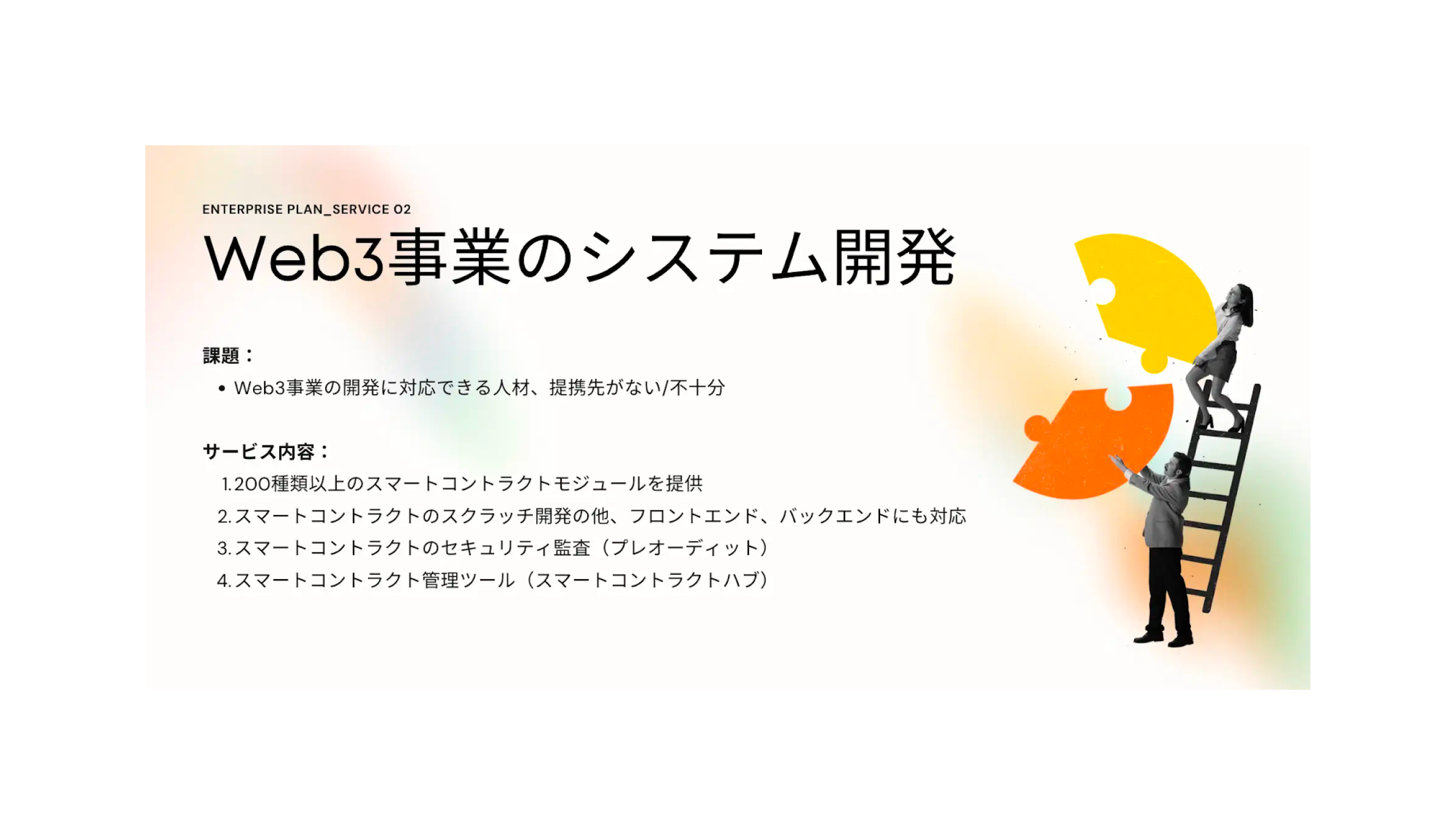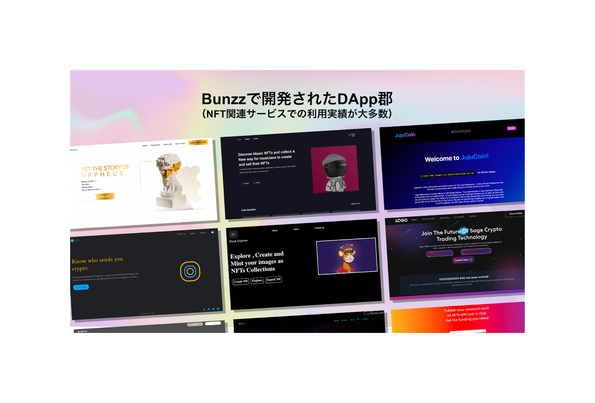 ・Web3事業のシステム開発に対応できる人材や提携先が不足している企業へ向け、BunzzのWeb3エンジニアチームが開発をサポートします。アジア最大級の開発インフラ「Bunzz」が蓄積してきた200種類以上のスマートコントラクトのテンプレートも利用可能。