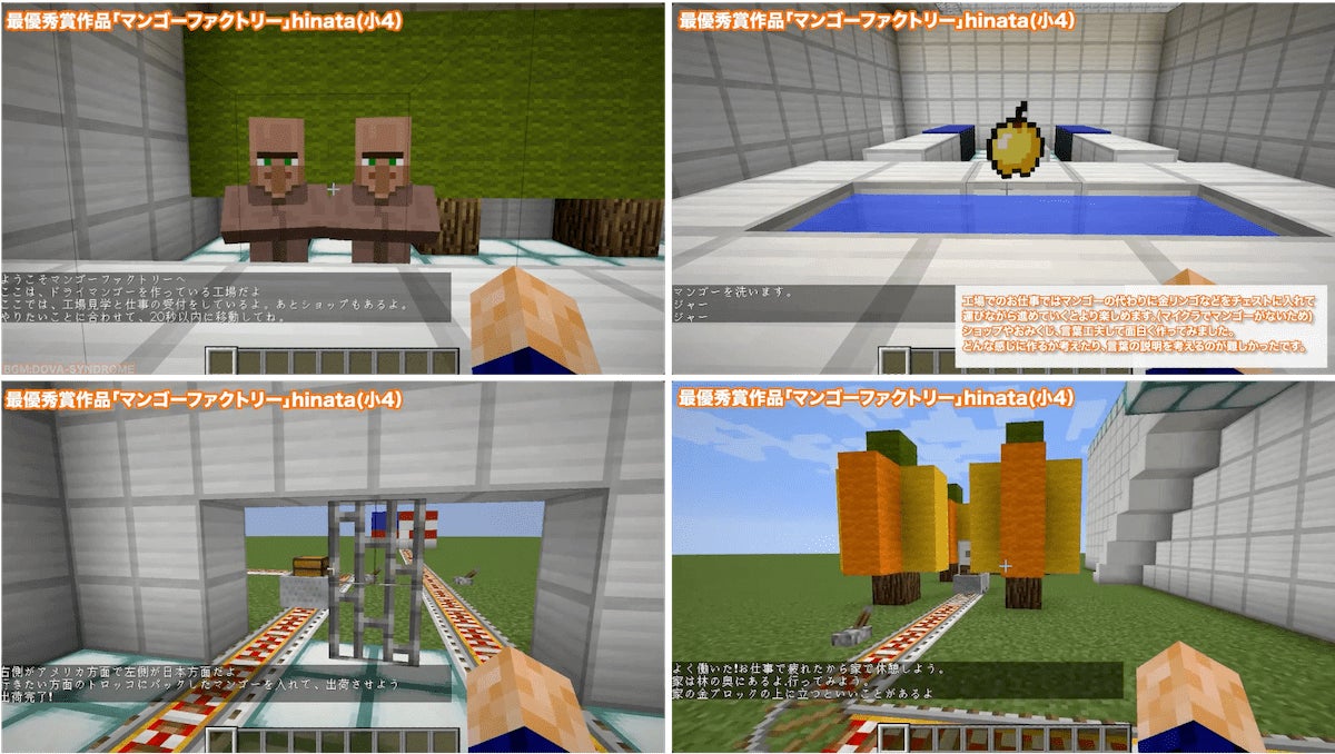 最優秀賞は、小学4年生のhinataさんの作品「マンゴーファクトリー」に決定。実際に体験した工場見学の様子を、マインクラフトで再現した作品となっています。