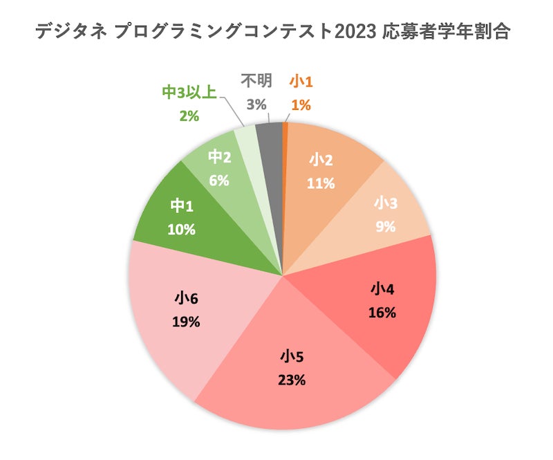 今年は、過去最高の174作品の応募があり、前年比120%となりました。応募者の79%が小学1年生〜6年生となっており、小学生でもプログラミングでゲーム制作を楽しめる環境が浸透している様子が伺えます。