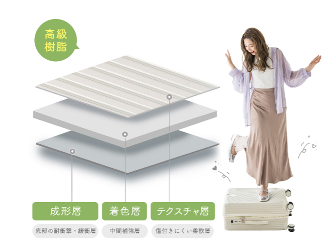 高級樹脂を使用しており、耐衝撃性に優れています。荷物を預けるのも安心です。