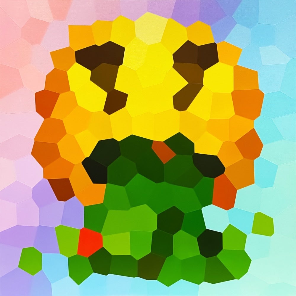 多角形のモザイクのようなフィルターを使ったポートレイト作品を中心とした絵画を発表。《近くよりも遠くからこそ知覚が可能な距離》をテーマに対人距離と絵画距離をリンクさせる。ポップアイコン、インフルエンサーからフォロワーまで、ありとあらゆる人物を並列に描く肖像画家である。