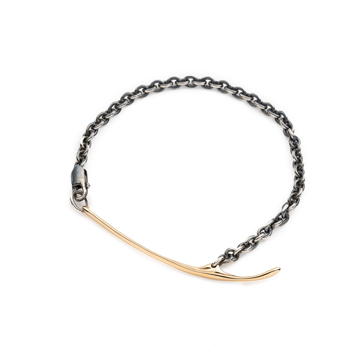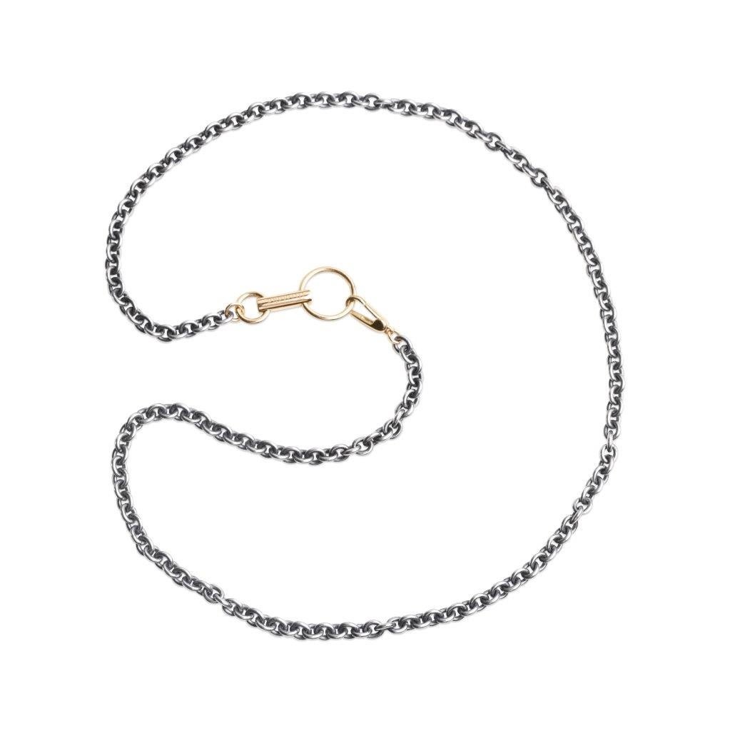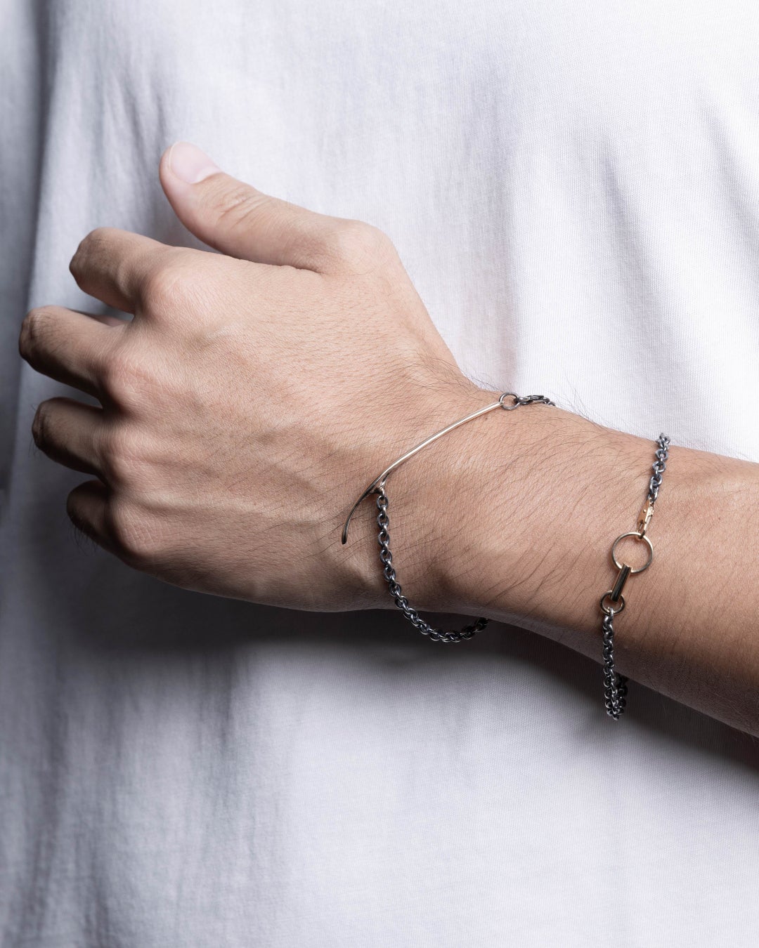 マッドブラックに仕上げられたシルバーの重厚感と、イエローゴールドの明るい輝きのコントラストが、スタイリングにモード感をプラス。
