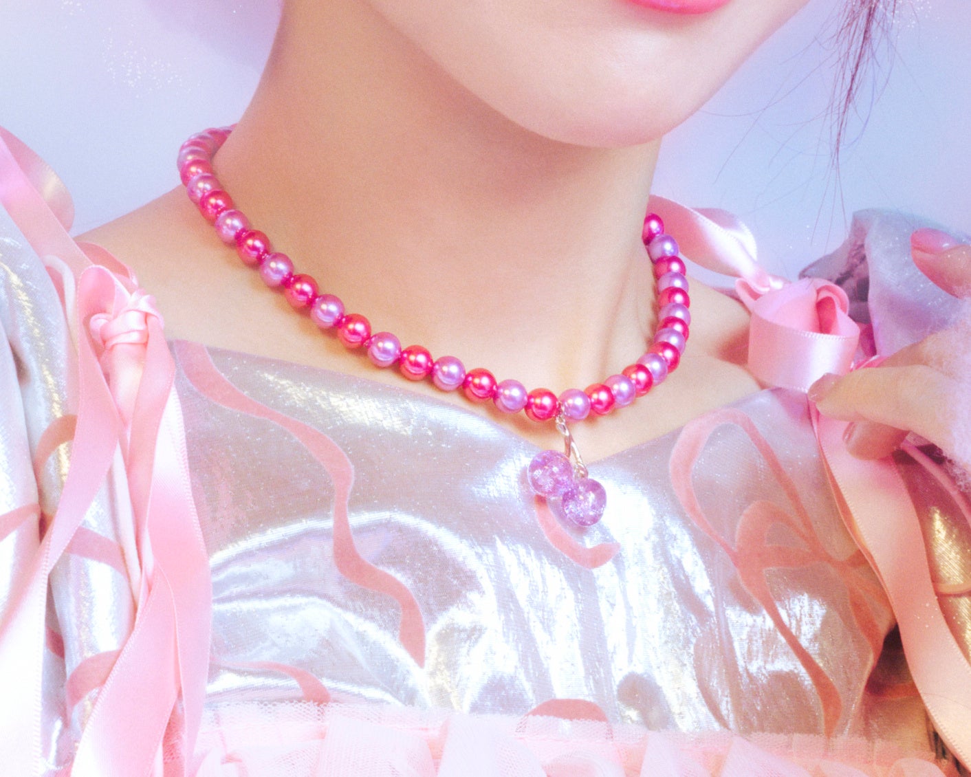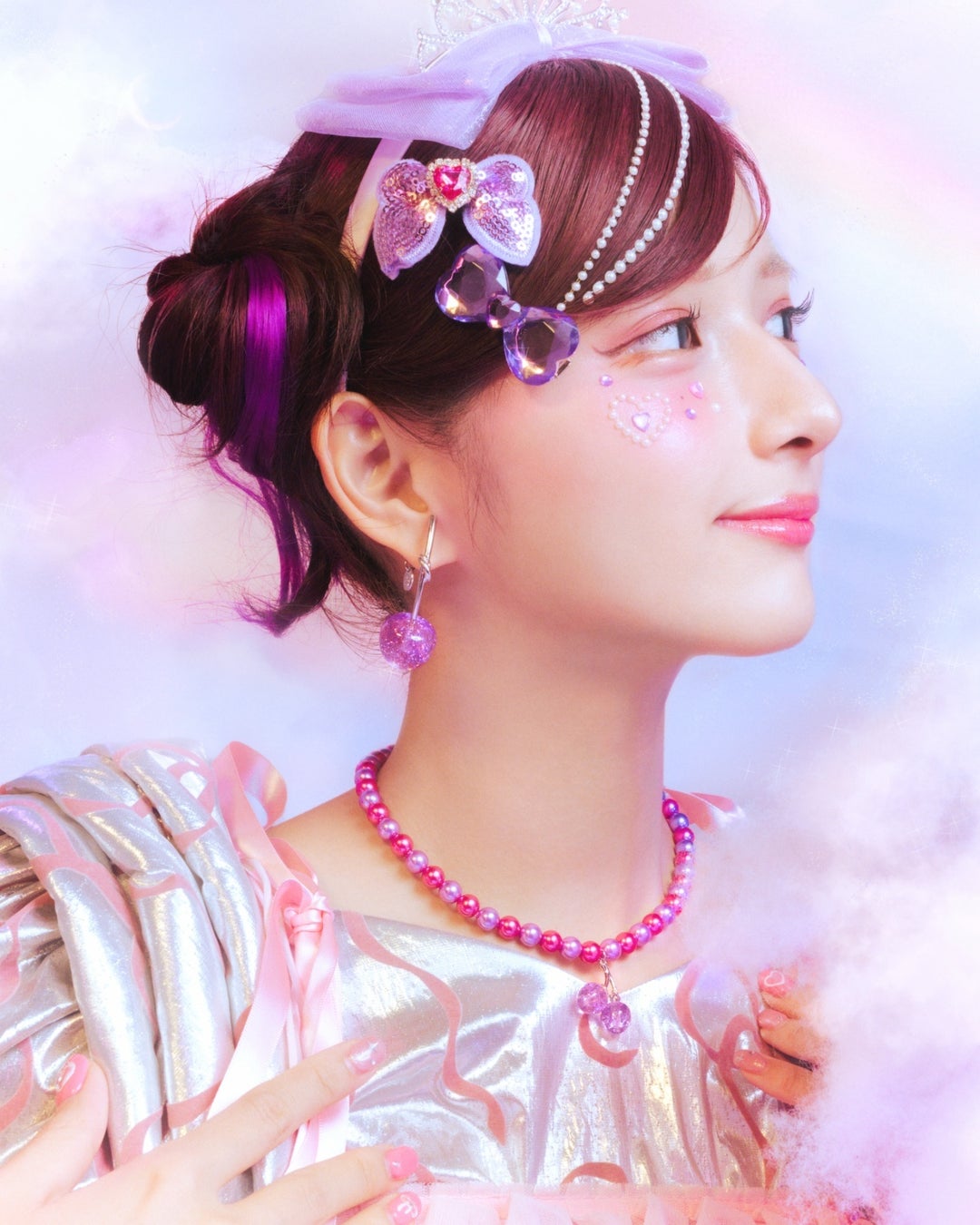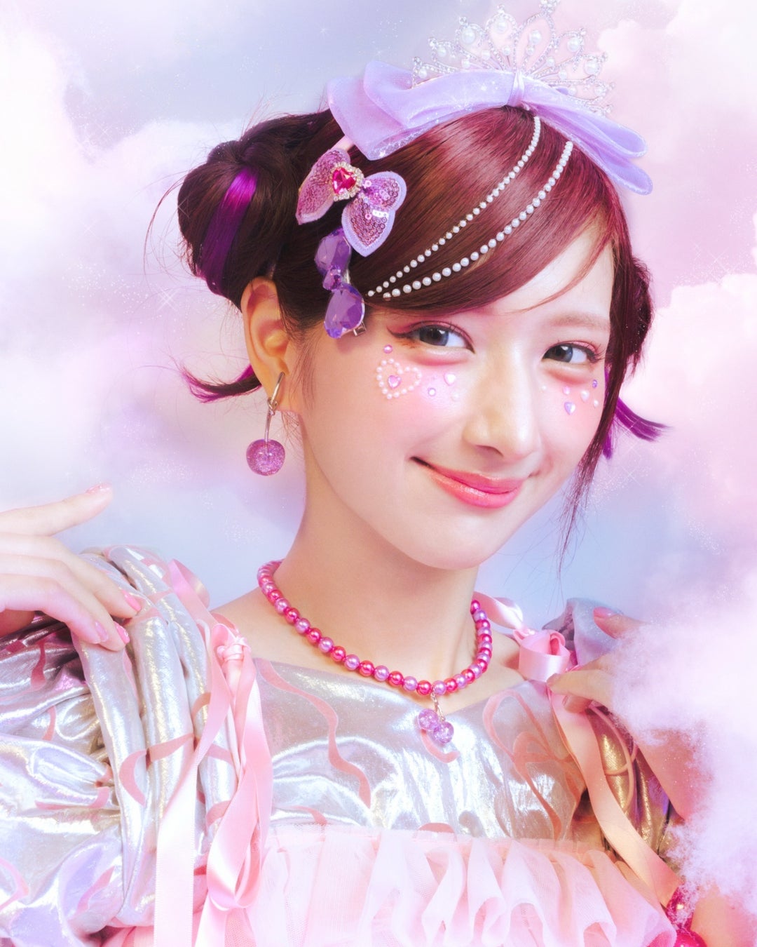 パール部分のカラーは、しなこさんがセレクトしたピンクとパープルを採用。鮮やかで可愛らしい配色が、カラフルなお洋服にも負けない存在感を放ちます。