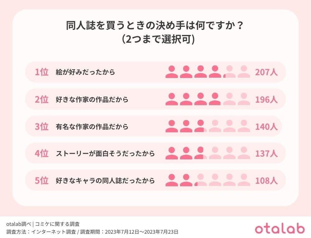 ・同人誌を買うときの決め手として最も多い理由は『絵が好みだったから』