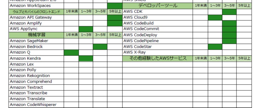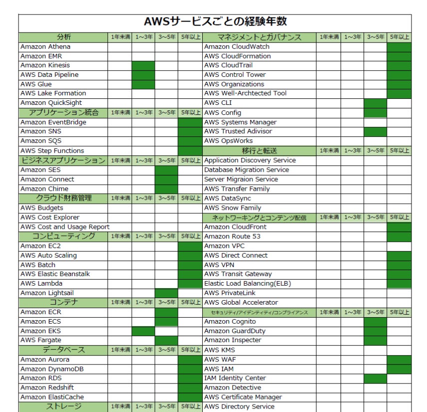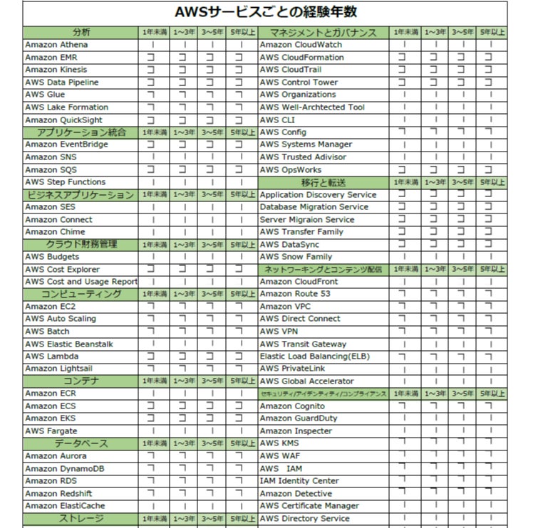 AWS特化のスキルシートは、AWSが展開する主要なAWSサービスをカテゴリーに分けて網羅しており、どのAWSサービスをどれくらいの期間扱ってきたかが一目で分かります。このことでエンジニアの持つスキルの伝え漏れや双方の認識齟齬が生じるのを防ぐことができます。